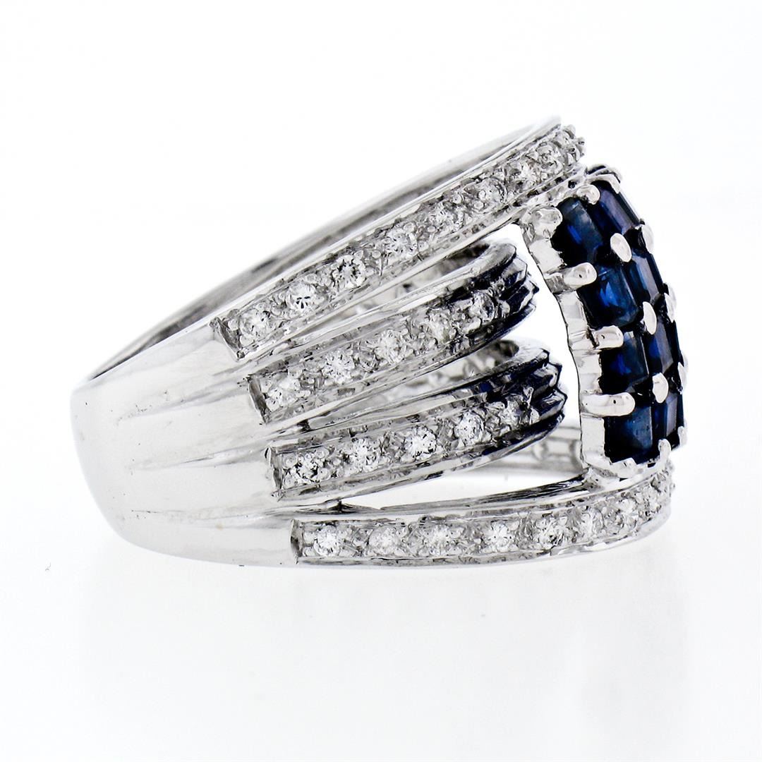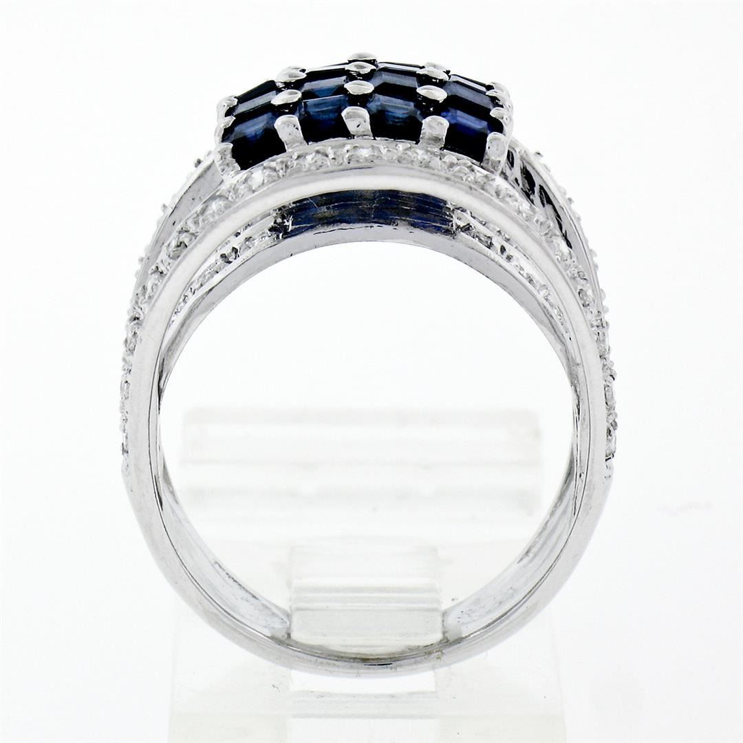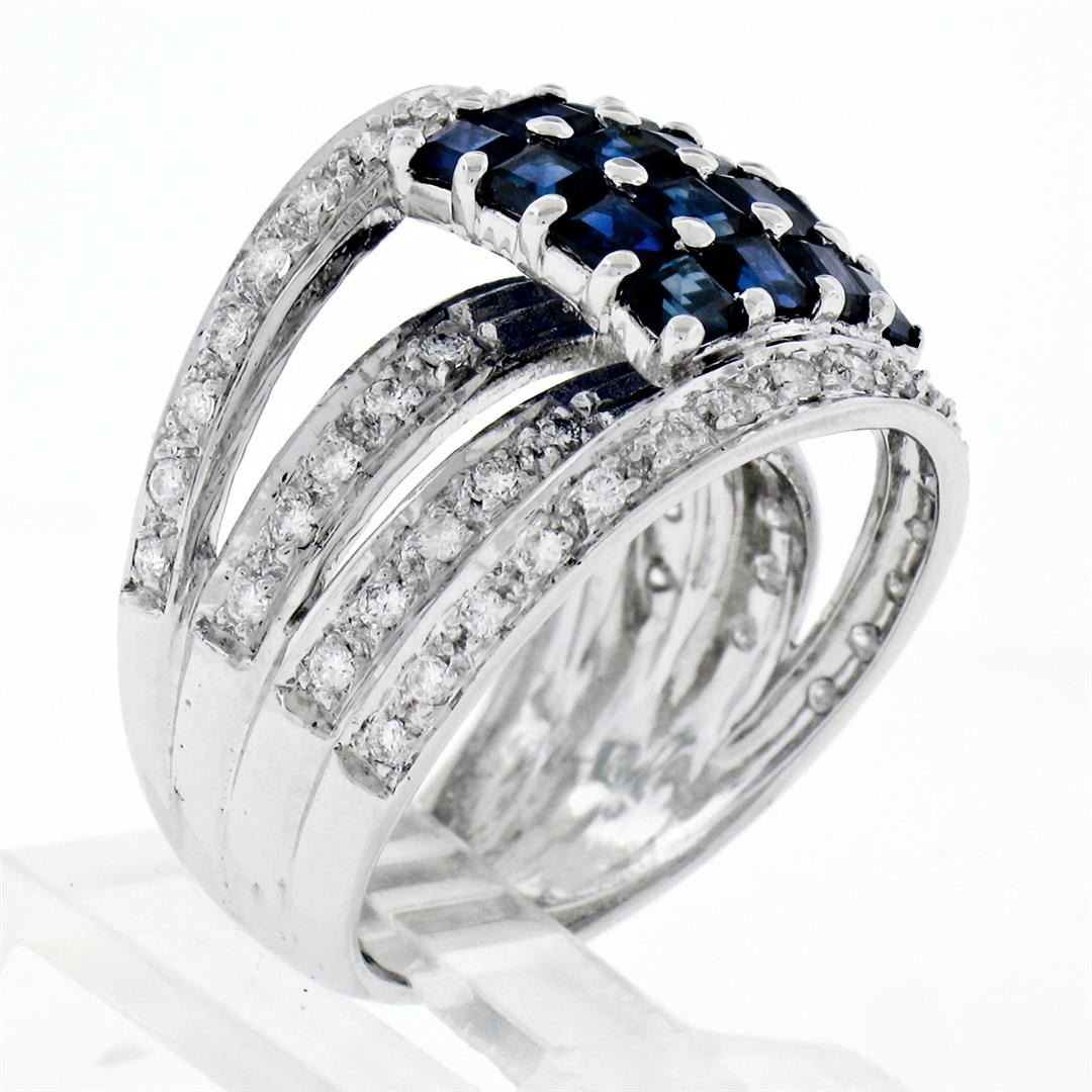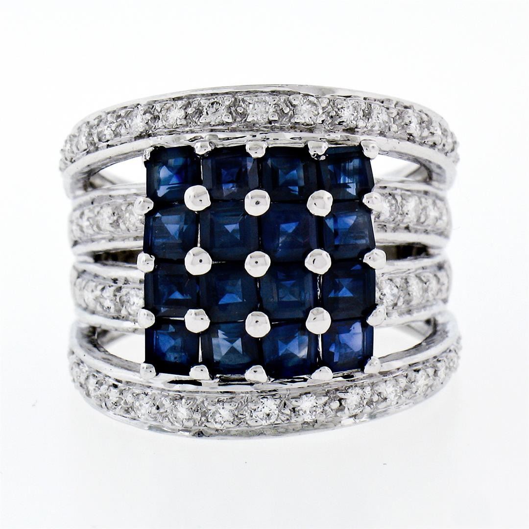 A new solid 18k whte gold square ring, with 16 round brilliant cut natural sapphires (2.50ctw), and 54 round brilliant cut natural diamonds ( F/G- VS1/VS2; 0.65ctw). The ring is size 6.5, weighs a total of 9.07 grams, and measures 17.0mm wide.