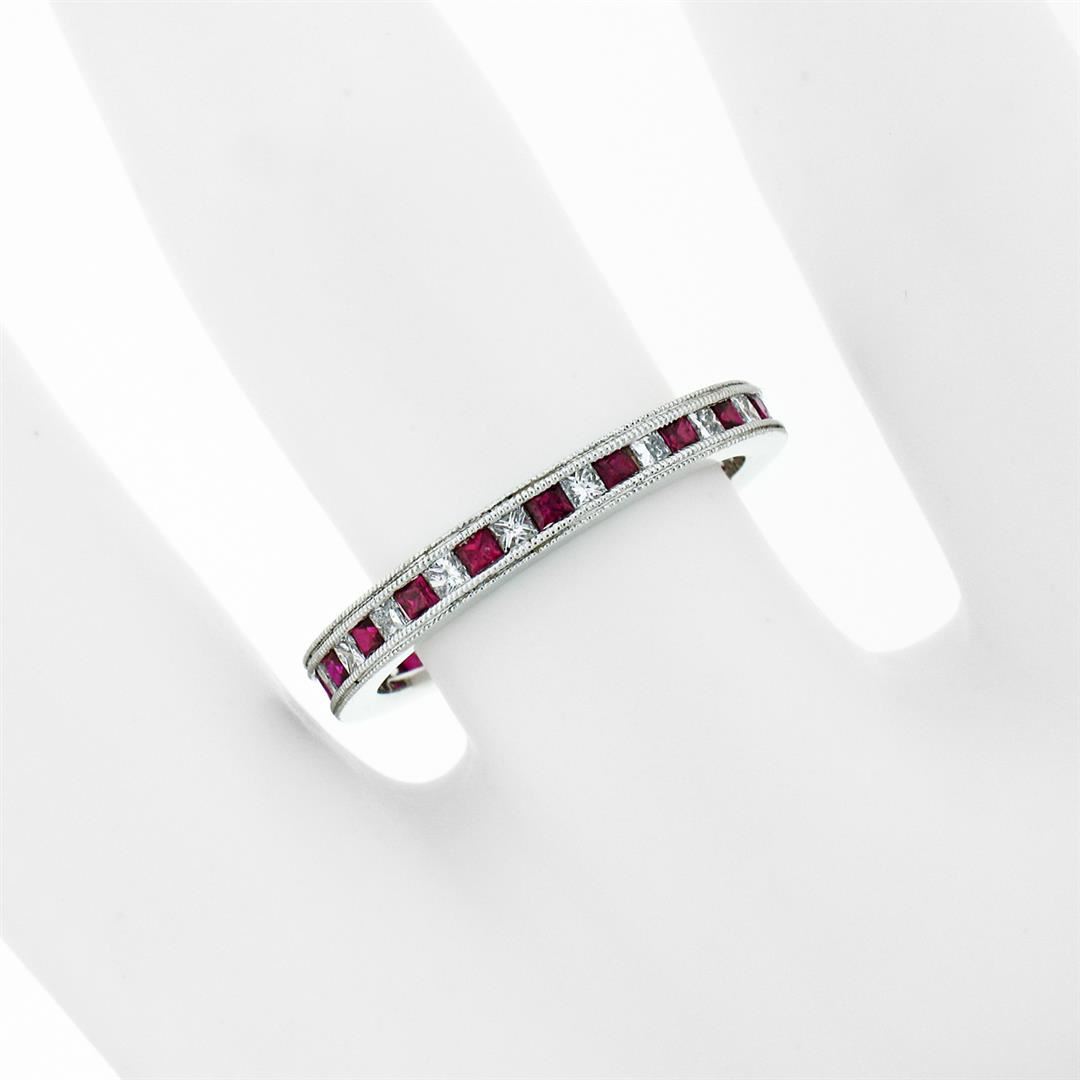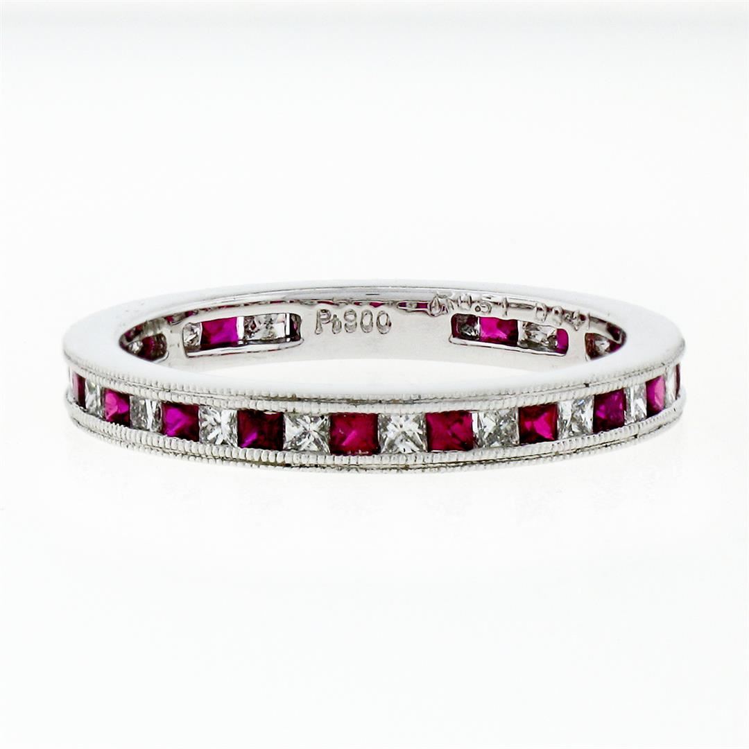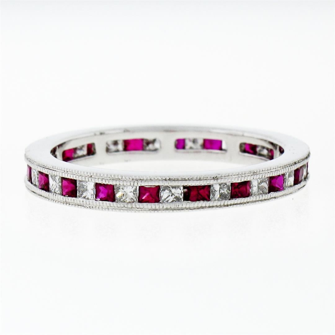 A new solid platinum eternity band ring, with 20 square calibre cut natural rubies (0.51ctw), and 20 square custom cut natural diamonds (G/H- VS1/VS2; 0.41ctw). The ring is size 6.0, weighs a total of 3.43 grams, and measures 2.70mm wide.
