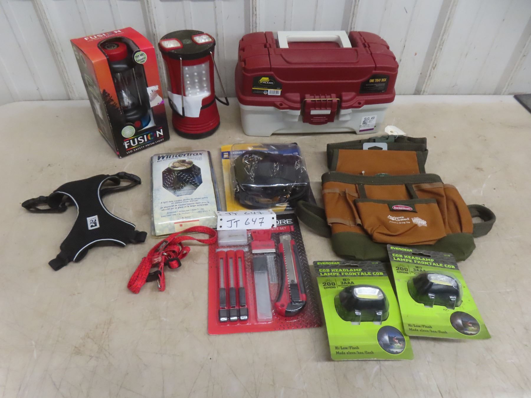 New: HD Ice Cleats, 13 pc Scissors/Knife Set, COB Headlamp, Tool Pouch, LED Pen Light, Tackle Box