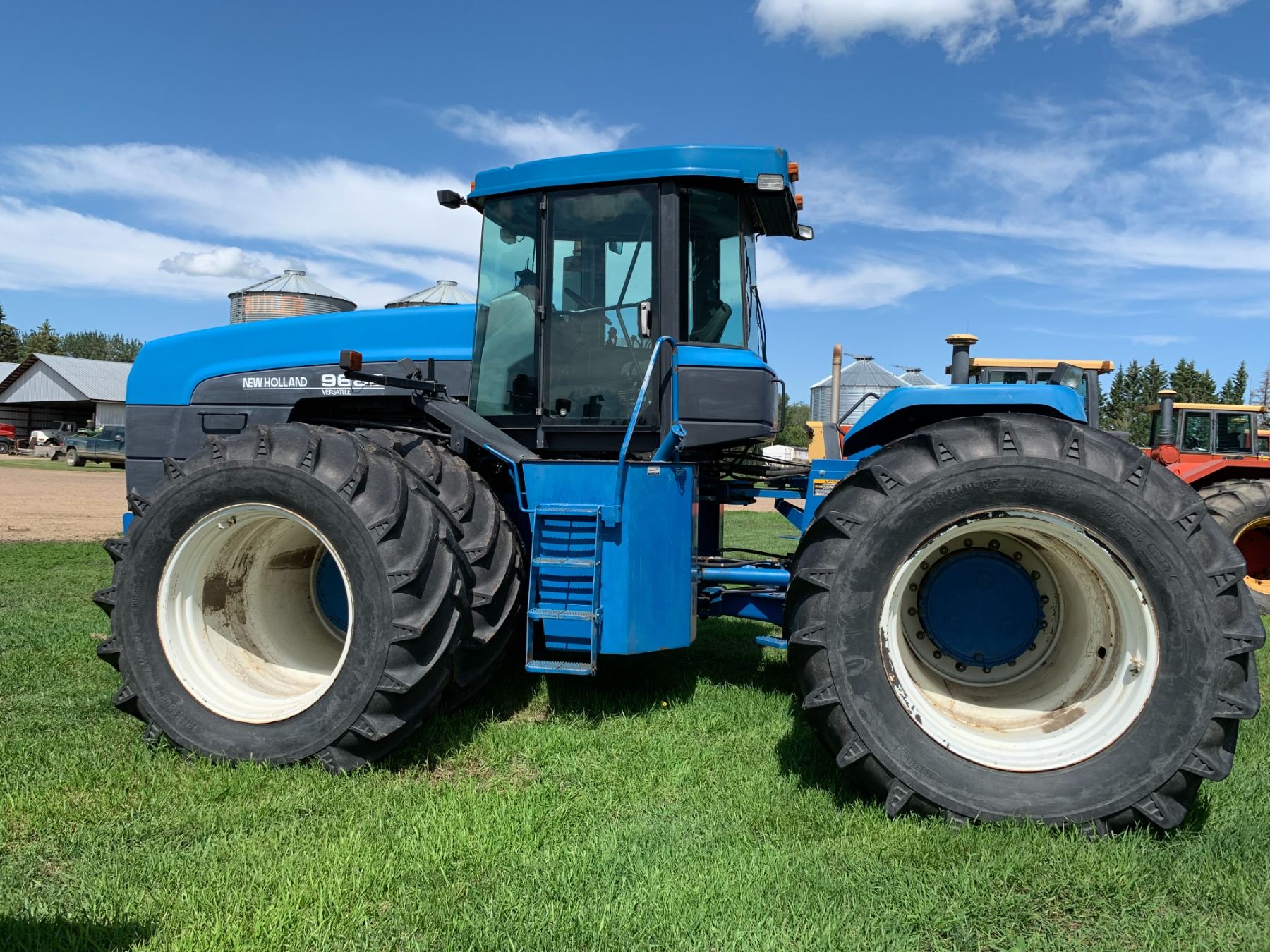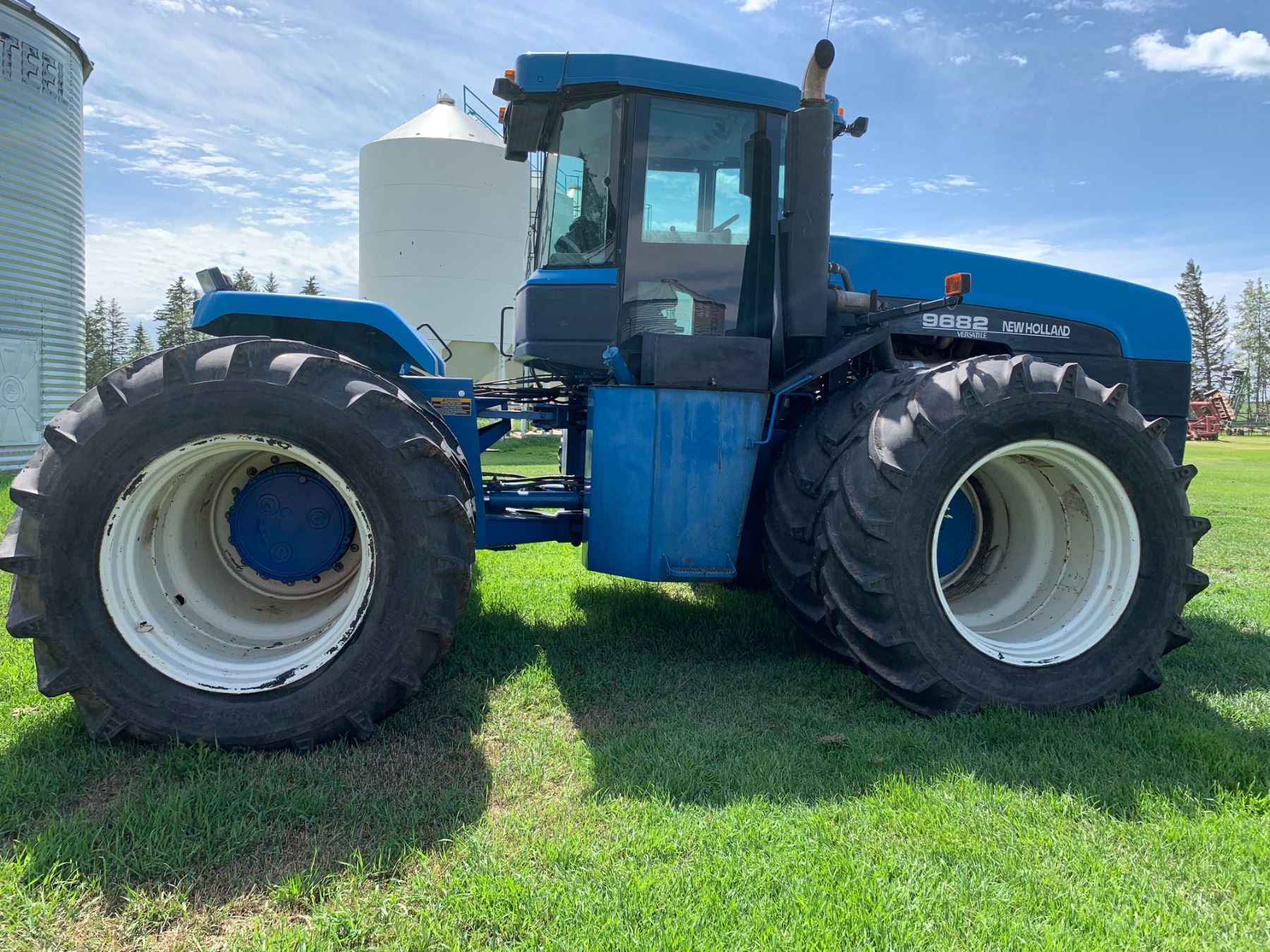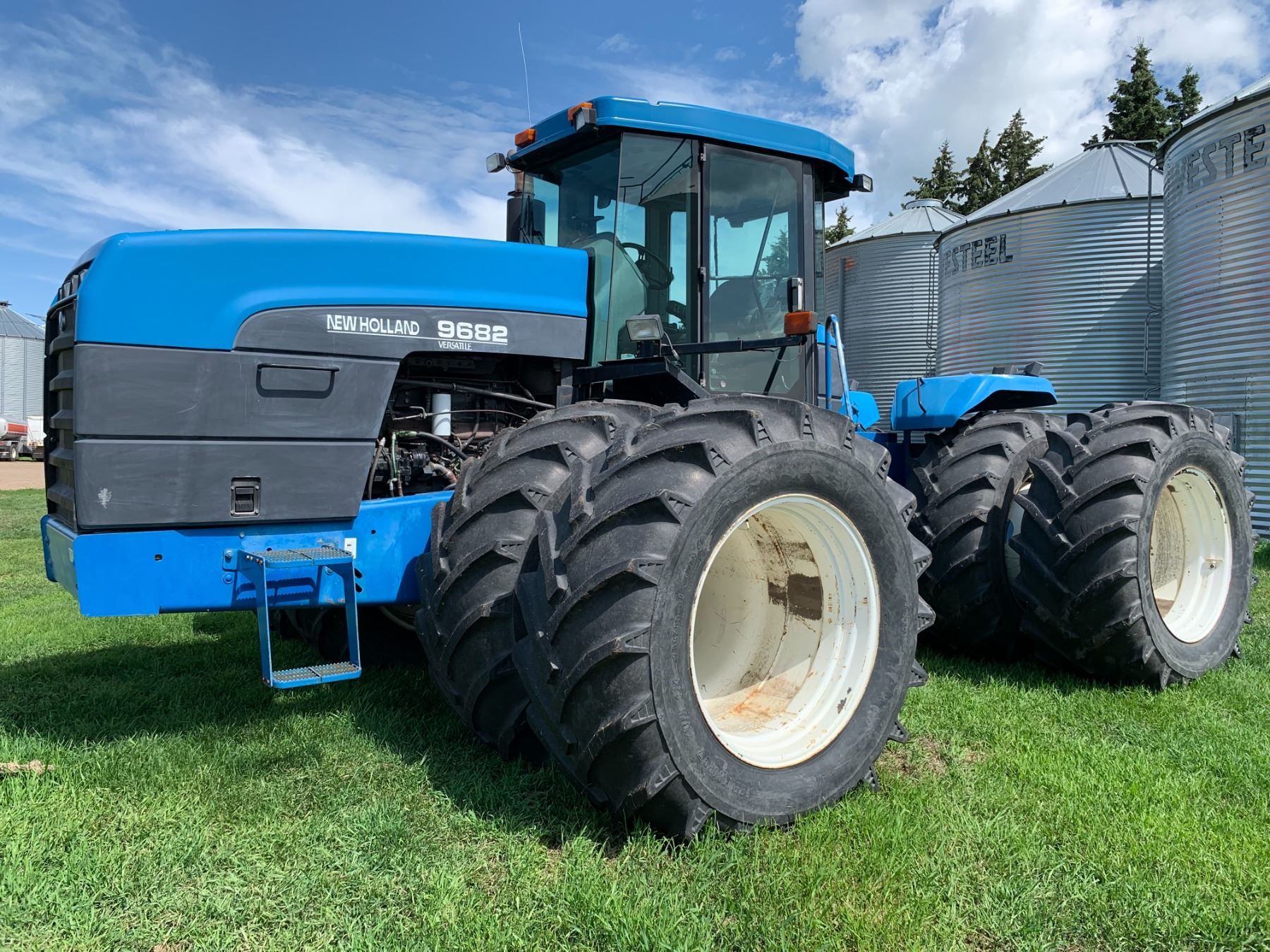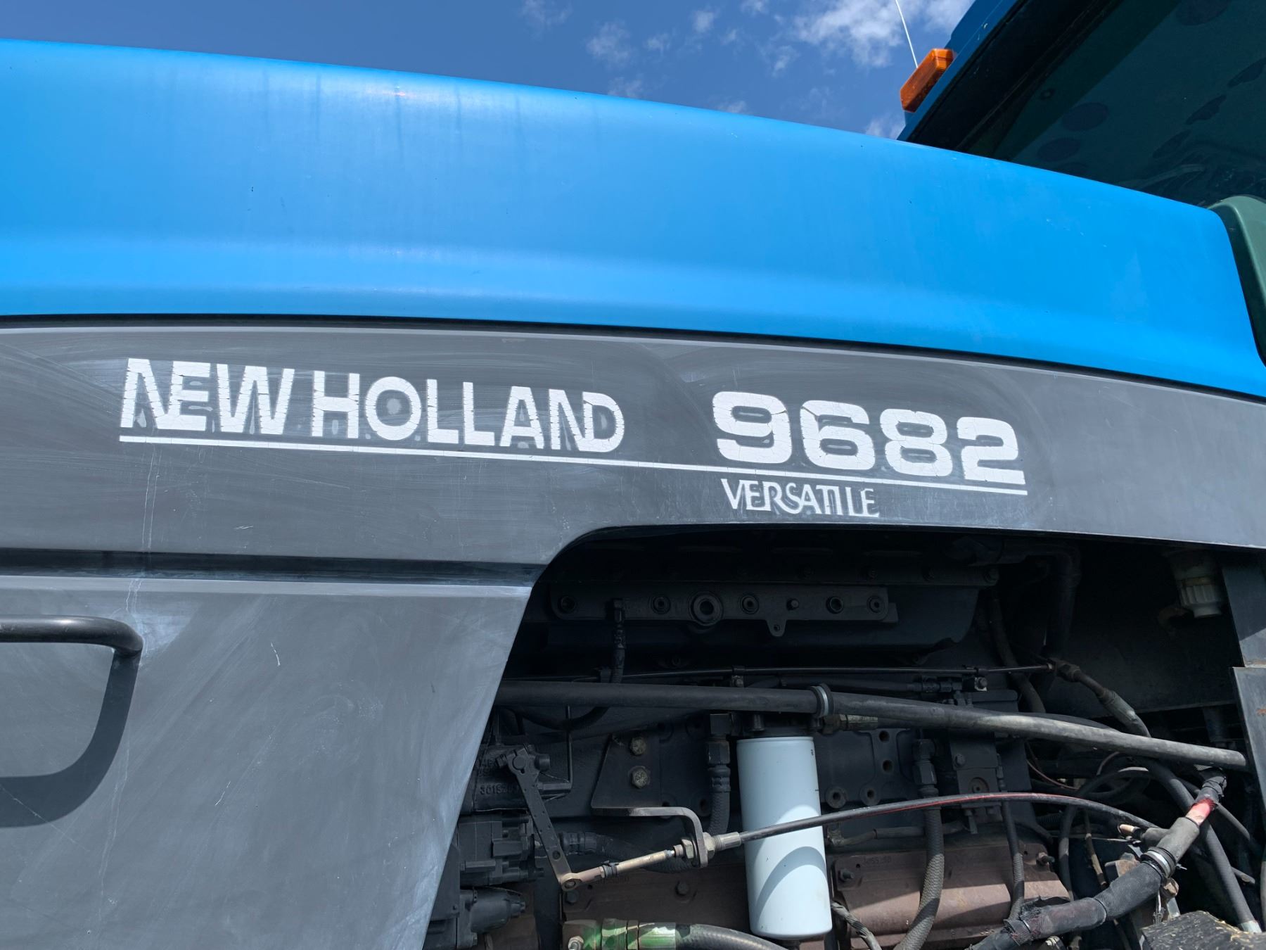 New Holland Versatile 9682 Tractor, 5 hyds, motor replaced from a 9862 425 HP, power shift, new flex plate, showing 2702 hrs, 700/65-38 tires, new rad & muffler, return line, new batteries, work orders, rebuilt implement control valve, all fluids have been replaced, c/w new headliner, hyd. pump, priority valve, AC comp., many new hyd. hoses, implement control cable & radio