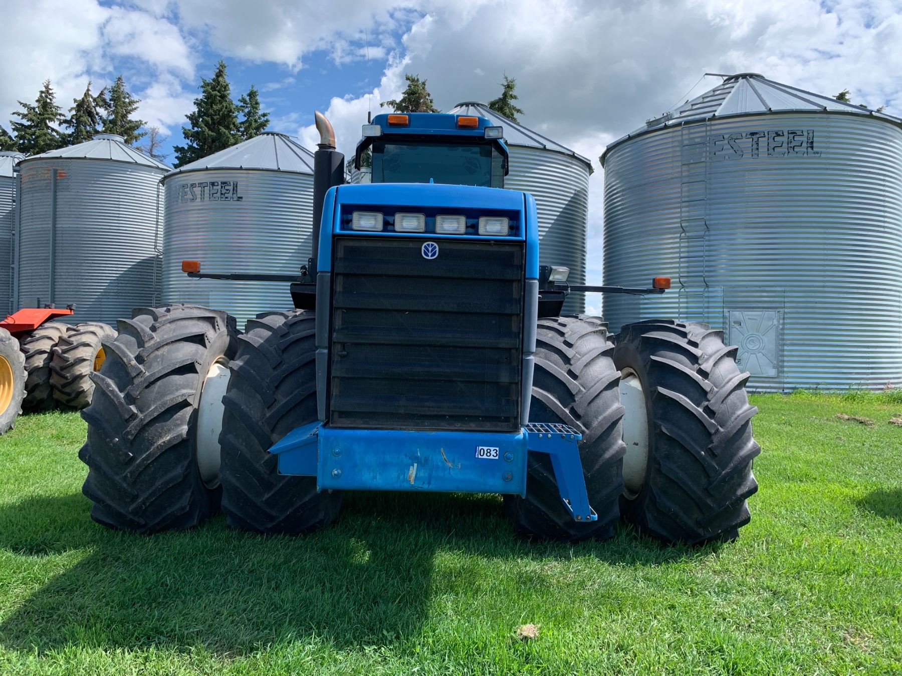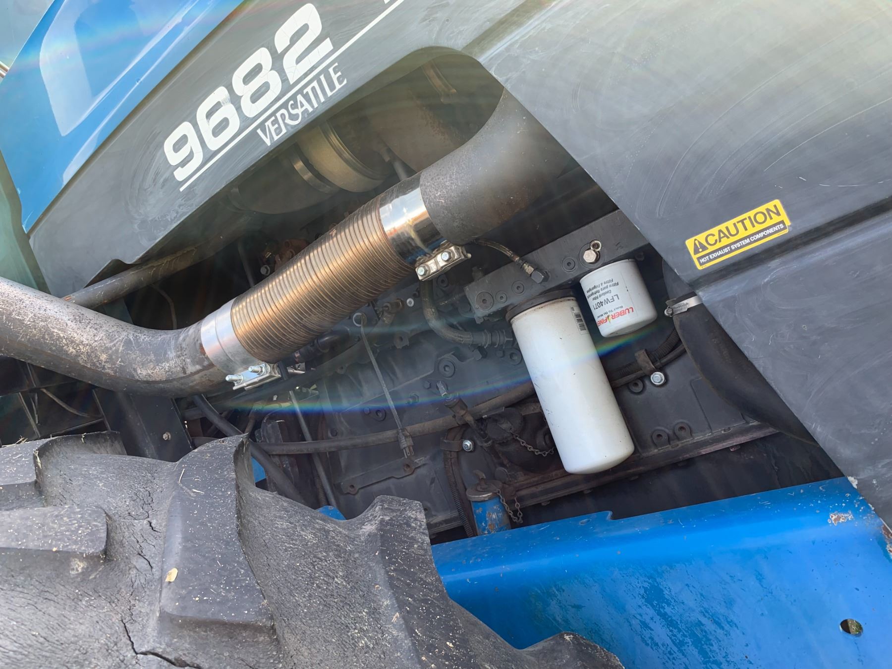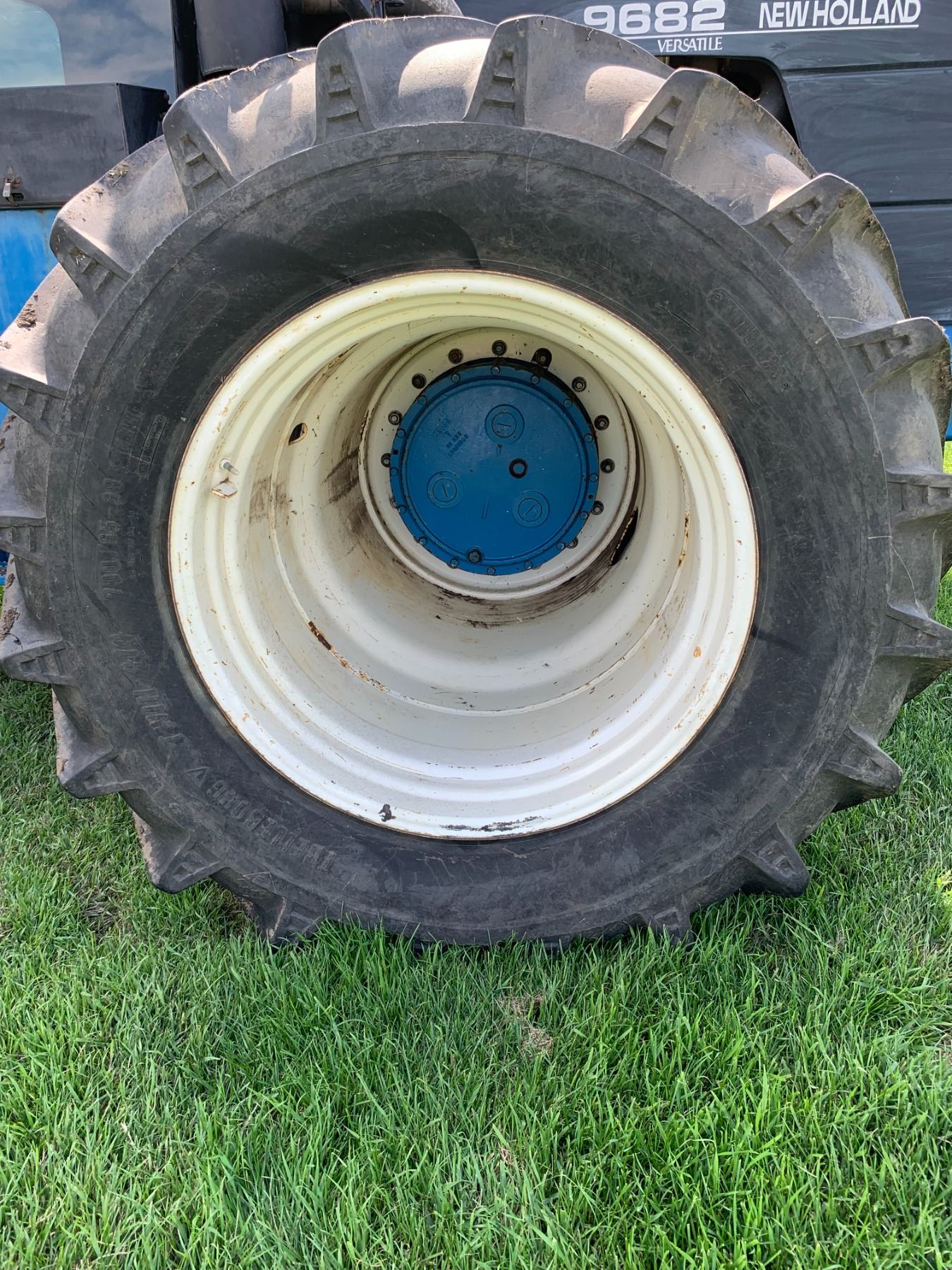 New Holland Versatile 9682 Tractor, 5 hyds, motor replaced from a 9862 425 HP, power shift, new flex plate, showing 2702 hrs, 700/65-38 tires, new rad & muffler, return line, new batteries, work orders, rebuilt implement control valve, all fluids have been replaced, c/w new headliner, hyd. pump, priority valve, AC comp., many new hyd. hoses, implement control cable & radio