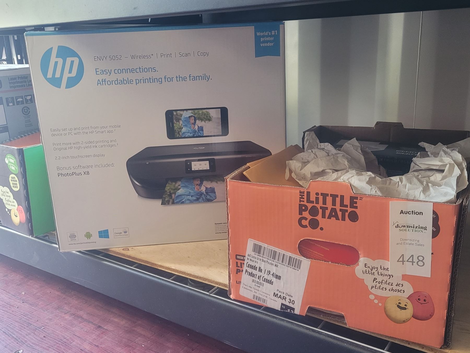 New in box hp envy 5052 printer and box of office supplies. Pickup at 10 am