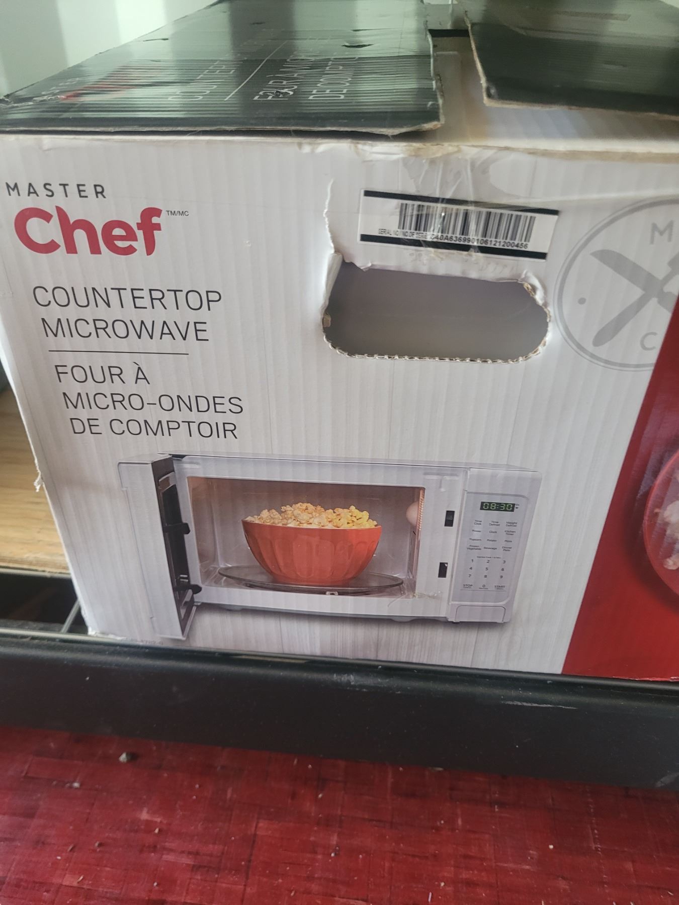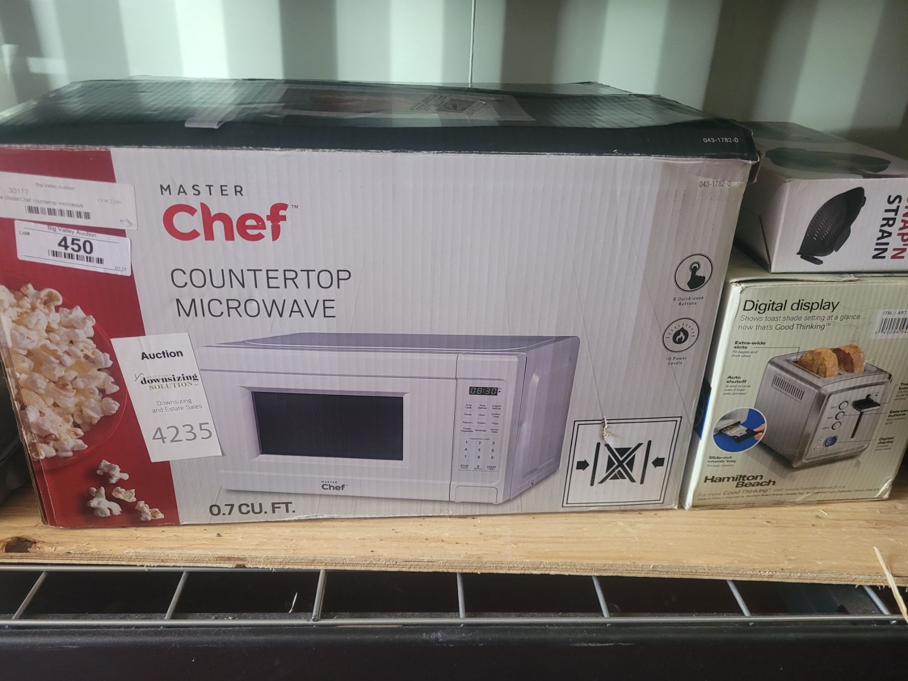 New in box Master Chef microwave oven, New, Hamilton Beach toaster and Snap & Strain.untested Pickup at 10 am
