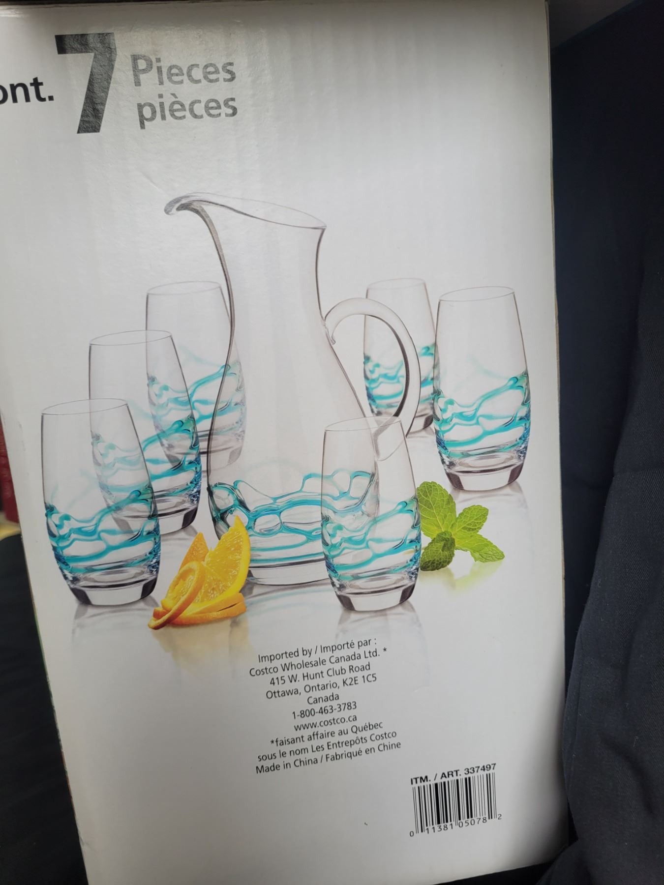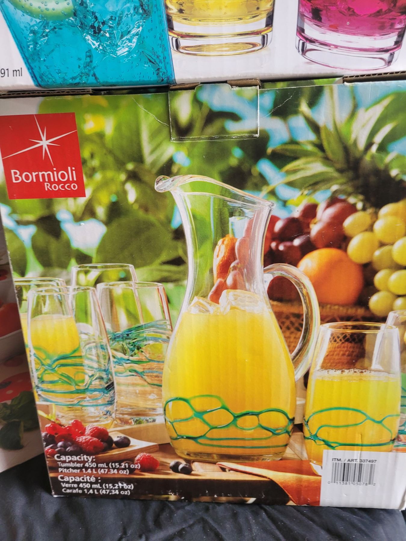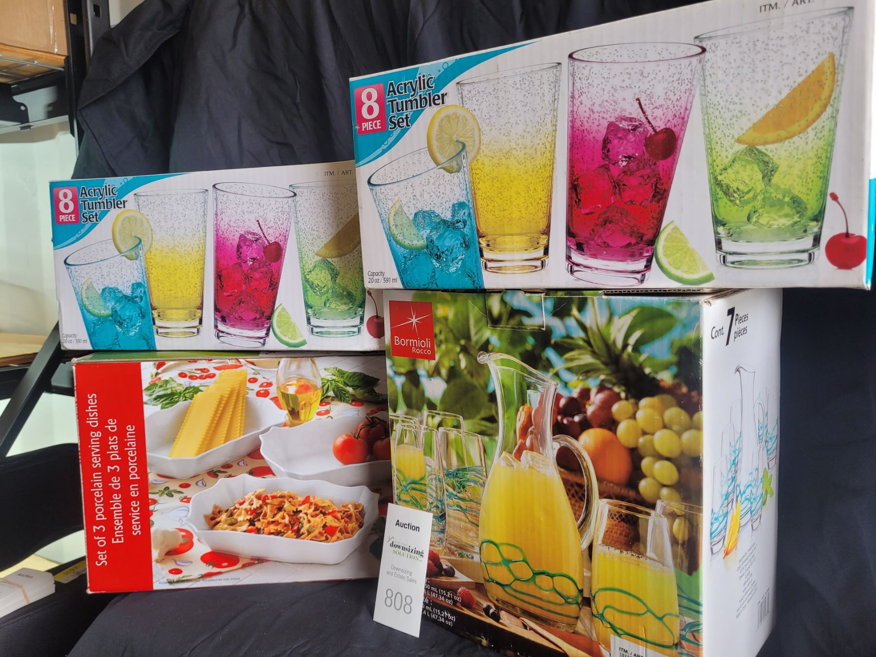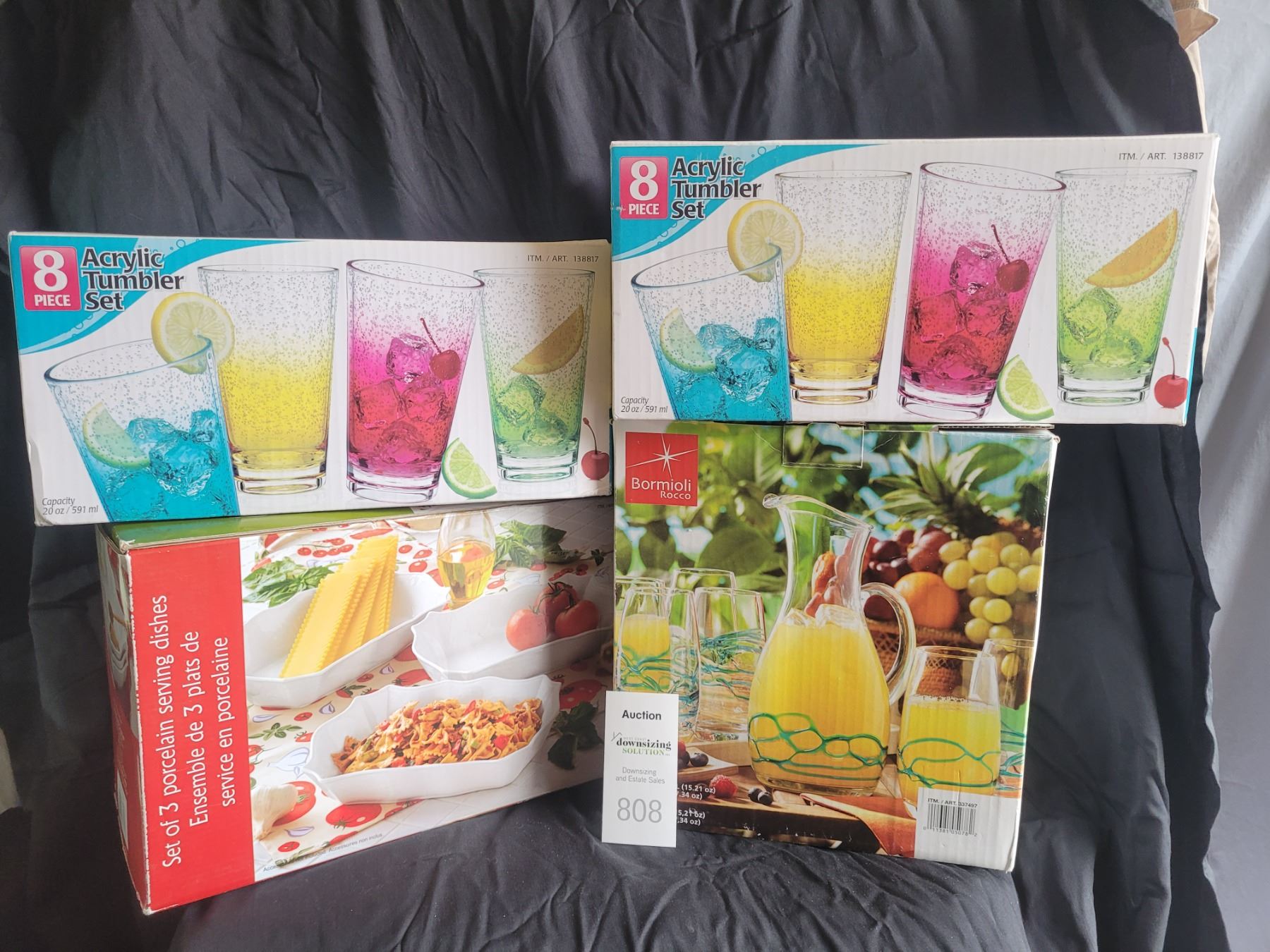2 voxes of Acrylic tumblers, Glass juice pitcher and glass tumblers. Set of 3 White servubg dishes. Pickup at 9 am