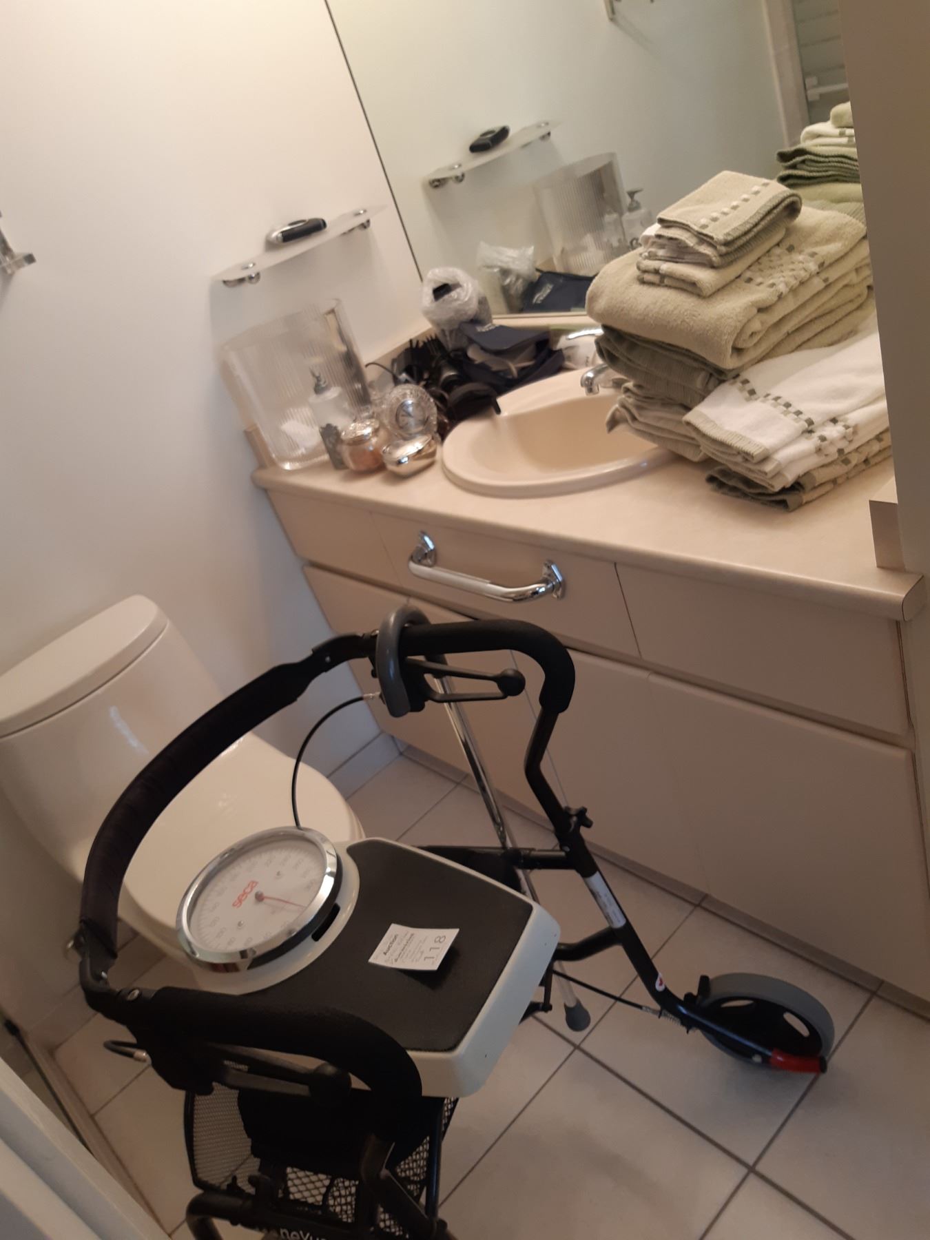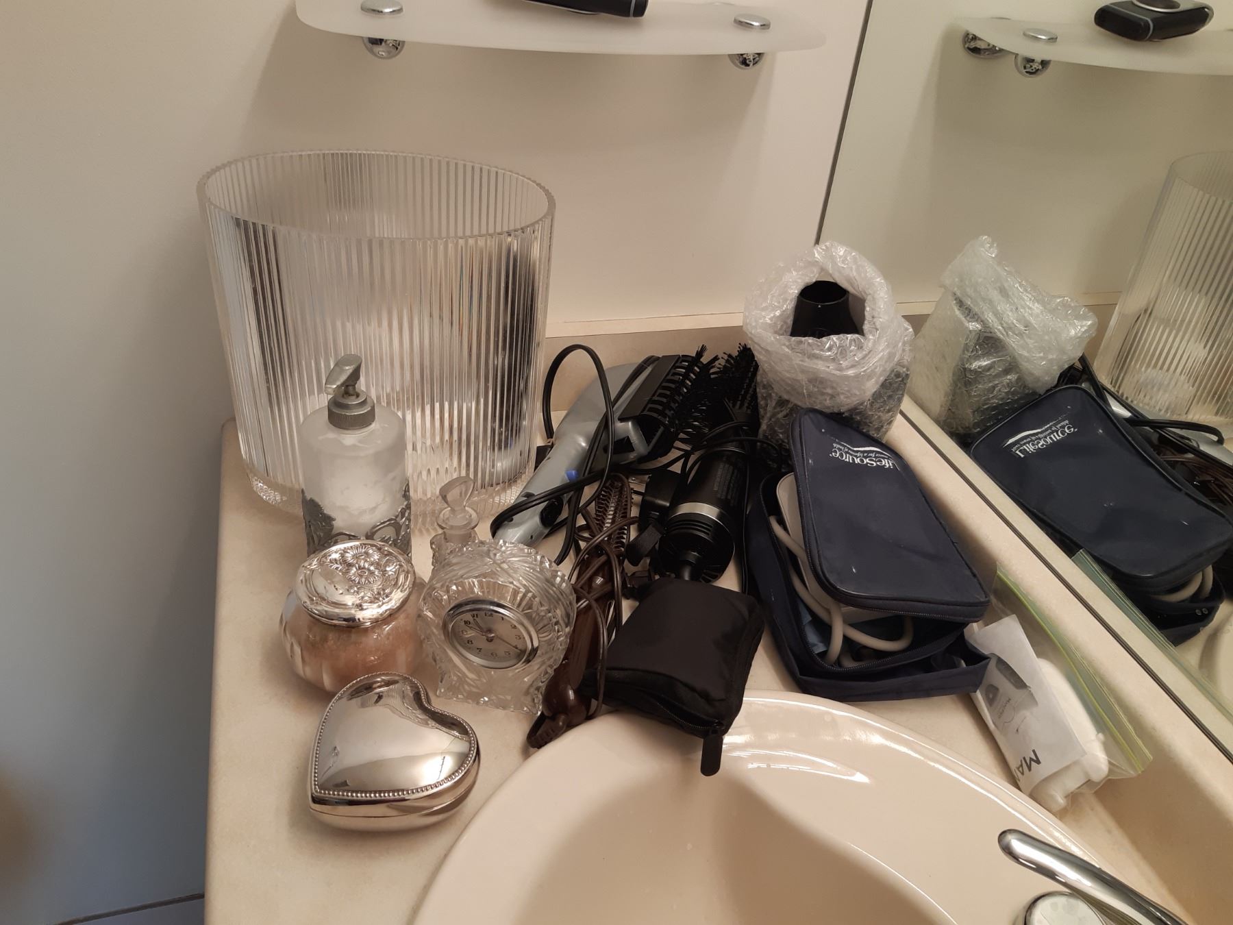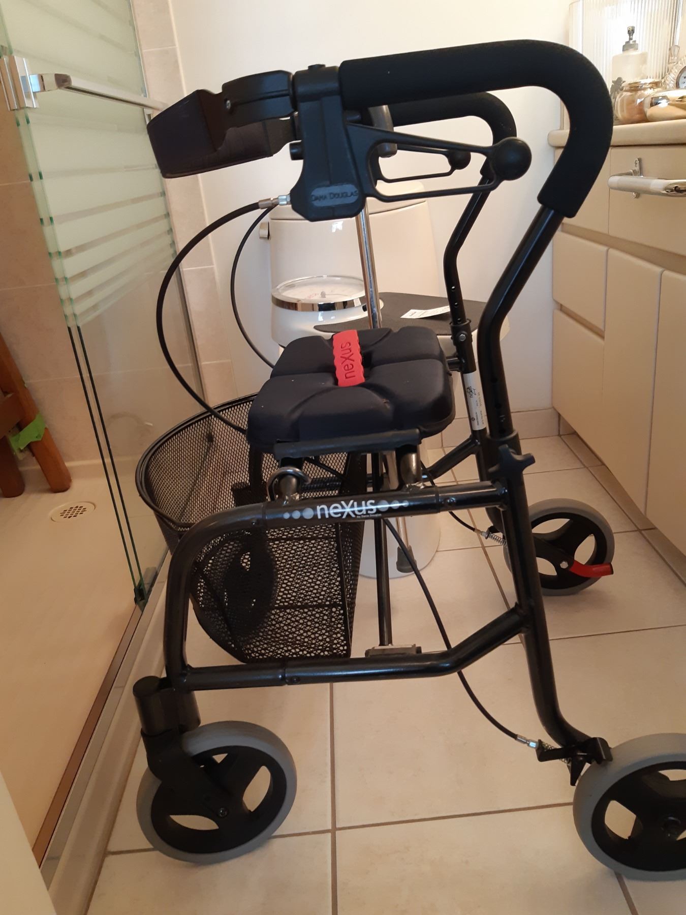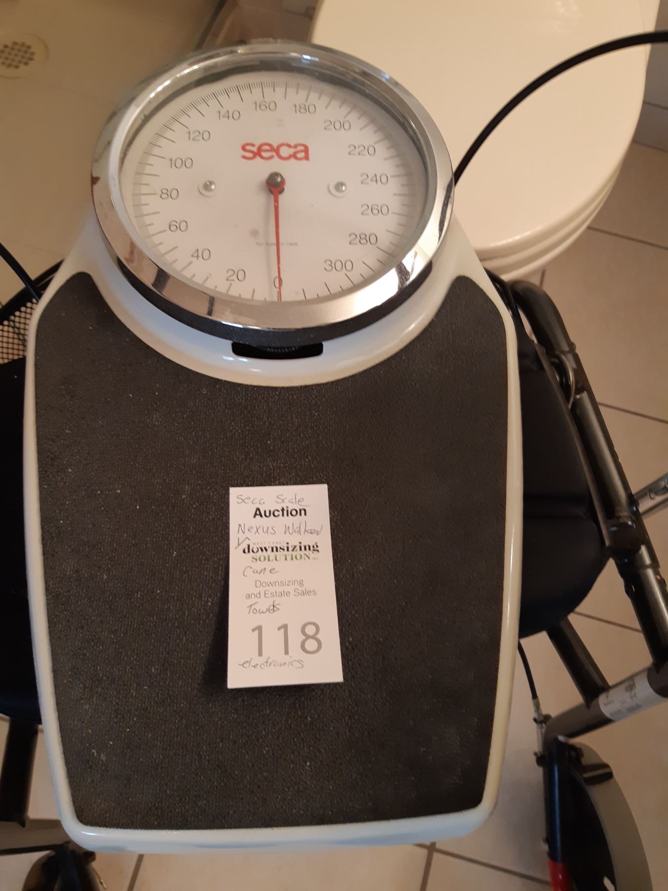 Nexsus Walker with basket, like new. Vintage Seca scales, Cane, Braun Shaver, German alarm clock, blow dryer, towels, curler, Life Source Blood Pressure Monitor Please note:Crystal & Silver Topped round powder jar shown in pictures has been removed. pickup 9am