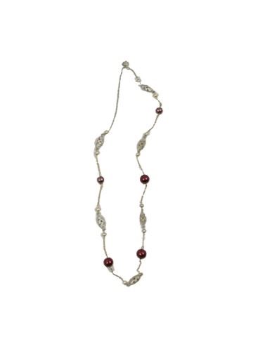 Carla (Penélope Cruz) screen worn, hero, silver colored metal with silver colored faux pearls and faux purple pearls necklace.