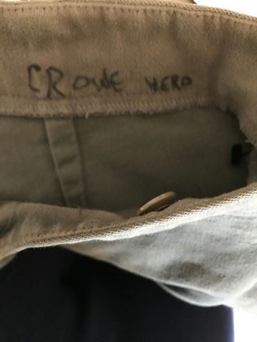 Noah (2014) - Noah Brown's (Russell Crowe) suede custom-made pants with stirrups. "Crowe, hero" written on the inside waist.