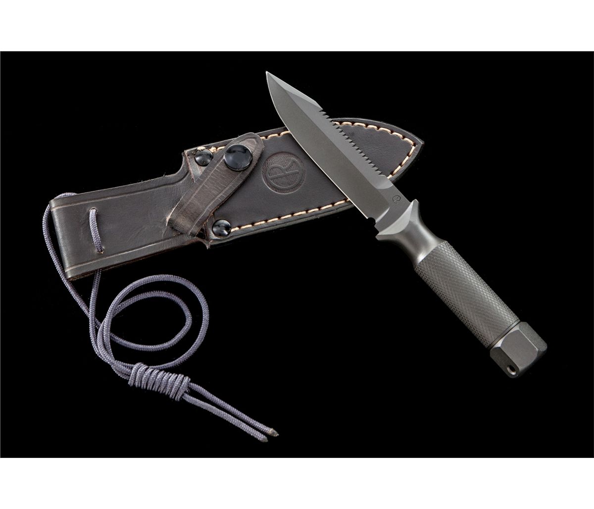 Numbered Chris Reeve Aviator Knife, solid one-piece construction, 4''clip-point sawback blade is marked ''CR'' with the reversed marked ''180.'' Overall length is 8''. Checkered handle, removable smooth aluminum butt cap with rubber o-ring. Black leather sheath is stamped ''CR'' on the front. Condition is excellent and as new, showing no use. Sheath with minor scuffs from storage. Est.: $400-$600. (Ernest A. Bryant III estate)
