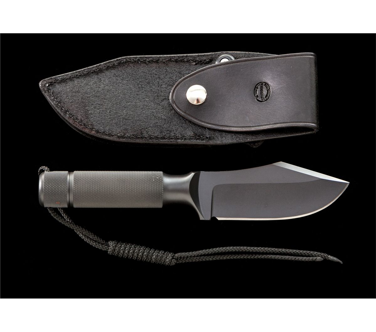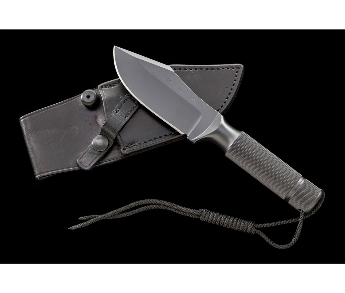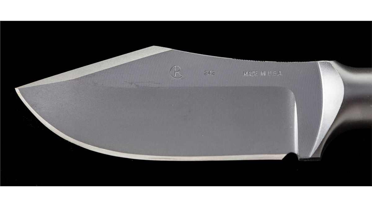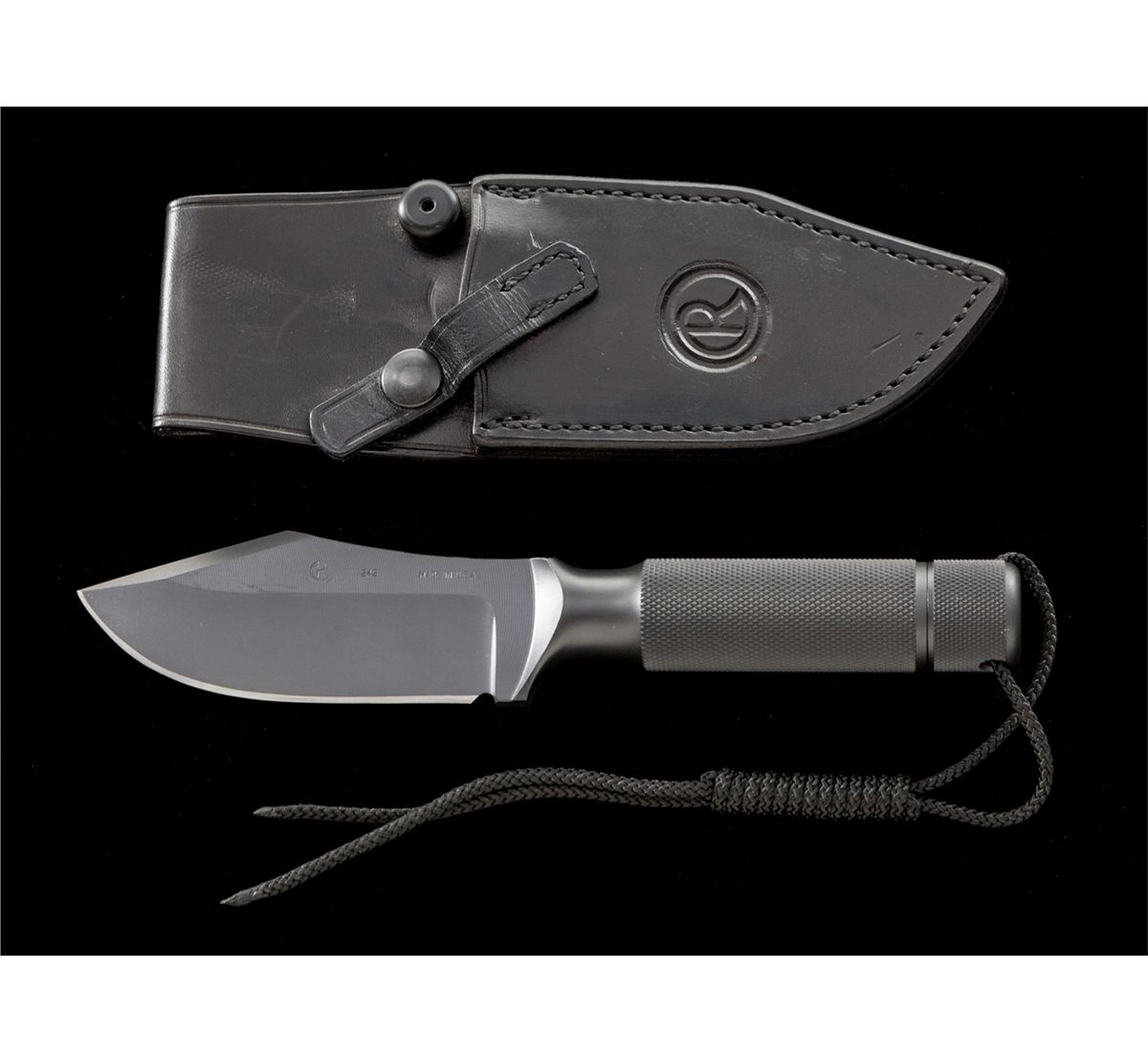 Numbered Chris Reeve Ubejane/Skinning Knife, solid one-piece construction, 4-1/2'' blade is marked ''CR, 242, MADE IN USA.'' The overall length is 9''. Checkered handle and checkered removable aluminum butt cap, rubber o-ring, with a black wrist thong. Black leather sheath by El Paso Saddlery Co. is stamped ''CR'' on the front. Condition is excellent and as new, showing no use. Sheath with minor scuffs and scratches from storage. Est.: $250-$350. (Ernest A. Bryant III estate)