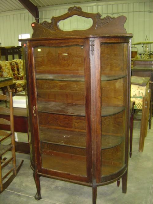 OAK CHINA WITH CURVED GLASS SIDES; CARVED CLAW & BALL FEET WITH WOOD SHELVES