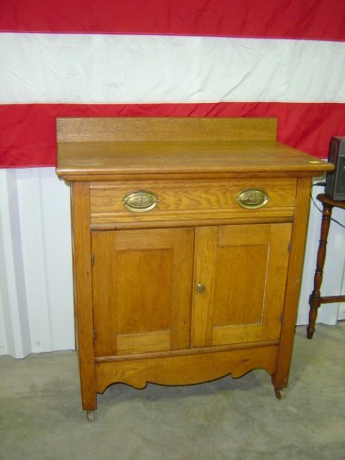 OAK WASH STAND SINGLE DRAWER W/ WOODEN PINS-OVER 2 DOORS; AGE CRACK IN DOOR PANEL; 28 1/2 X 16 X 33 1/2 TALL