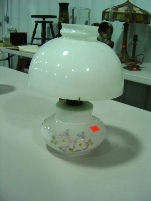MILK GLASS OIL LAMP BASE, FLOWERS PAINTED ON BASE AND GLASS SHADE (SHADE HAS SOME DAMAGE)