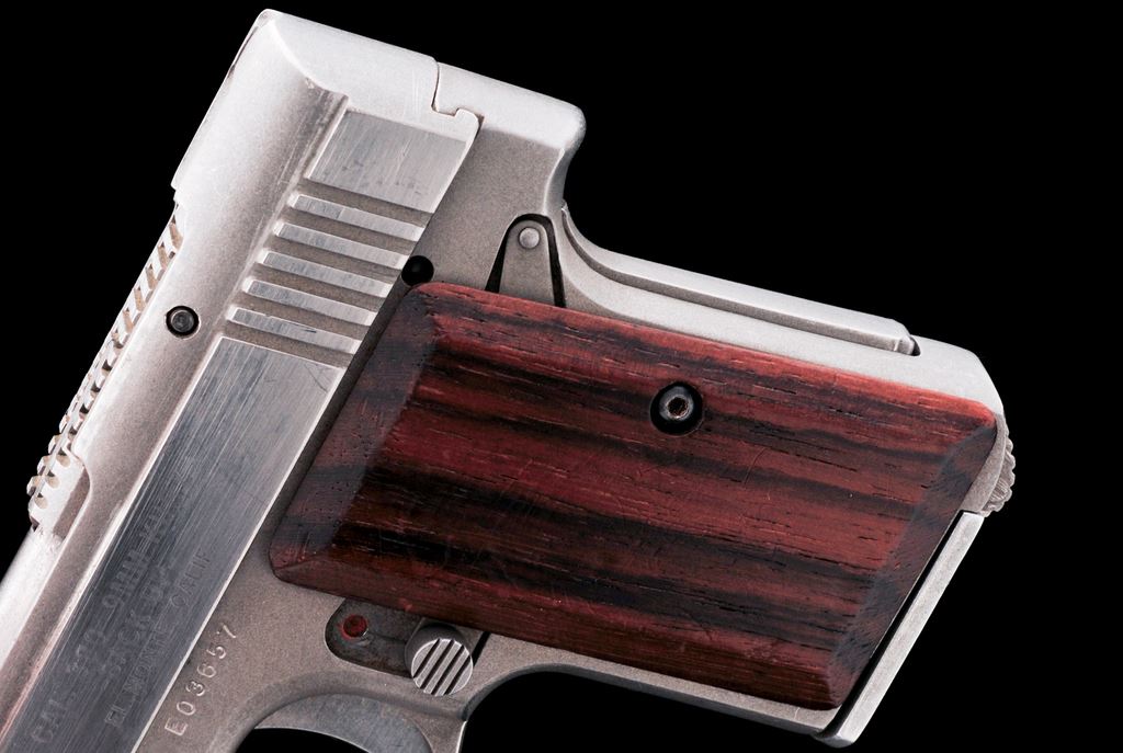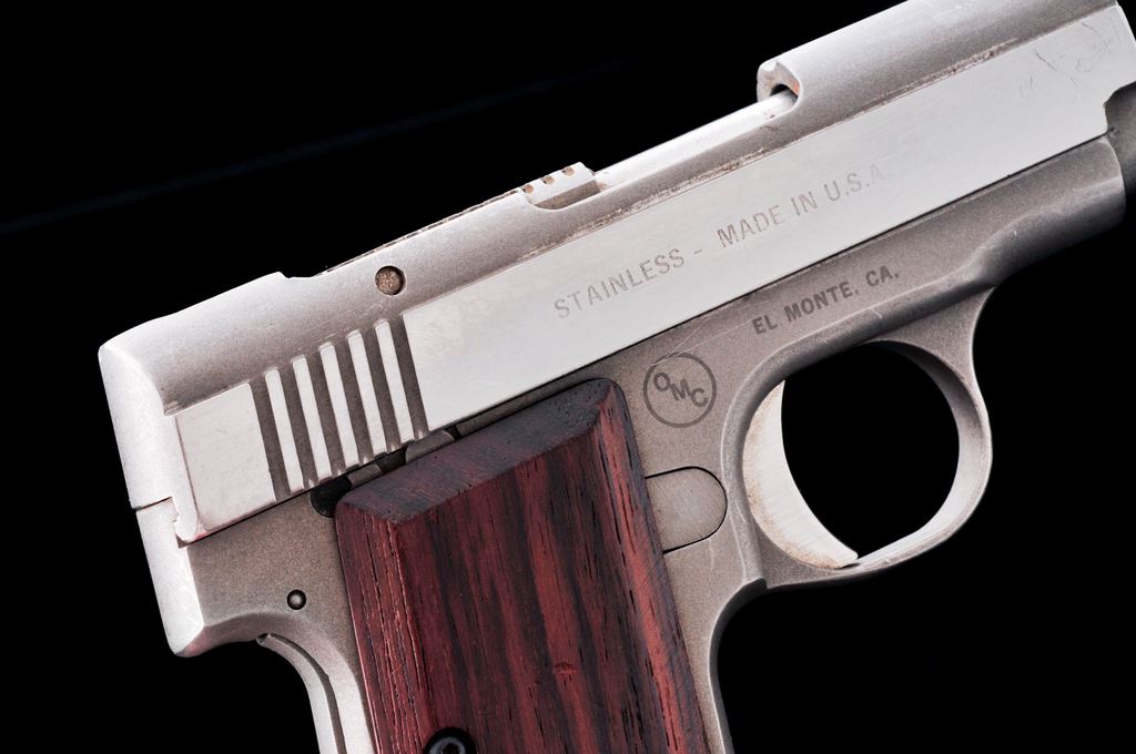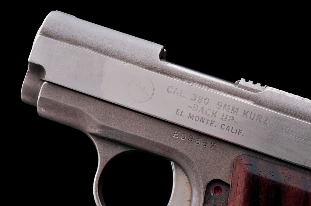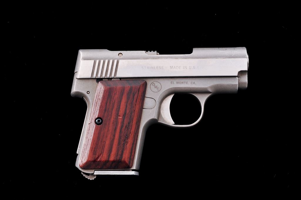OMC Back-Up Semi-Automatic Pistol, #E03657, .380 cal., 2.5'' barrel, stainless steel, smooth beveled rosewood grips, with one factory magazine. Condition is about fine showing light to moderate scuffs from carry and just light general use. Grips with mild impressions. Good action, fine bore. Est.: $250-$400. (Modern/PPT)