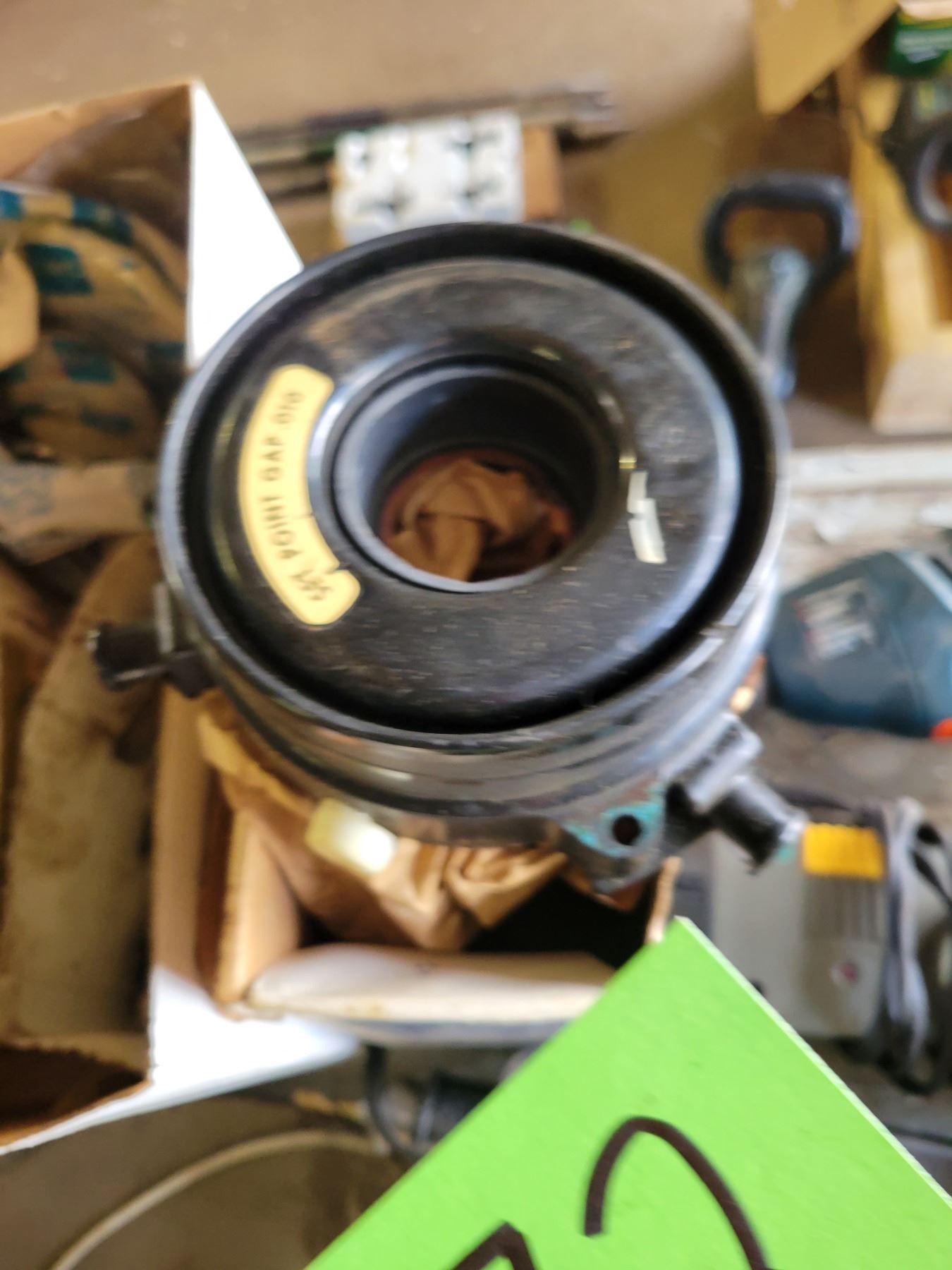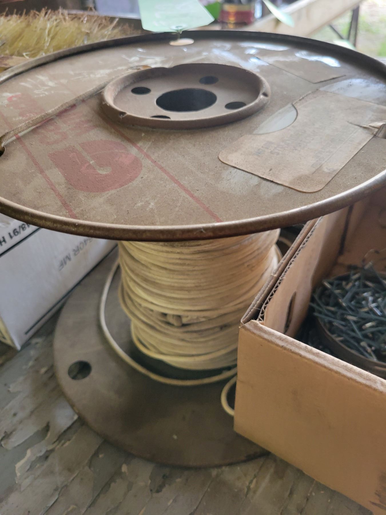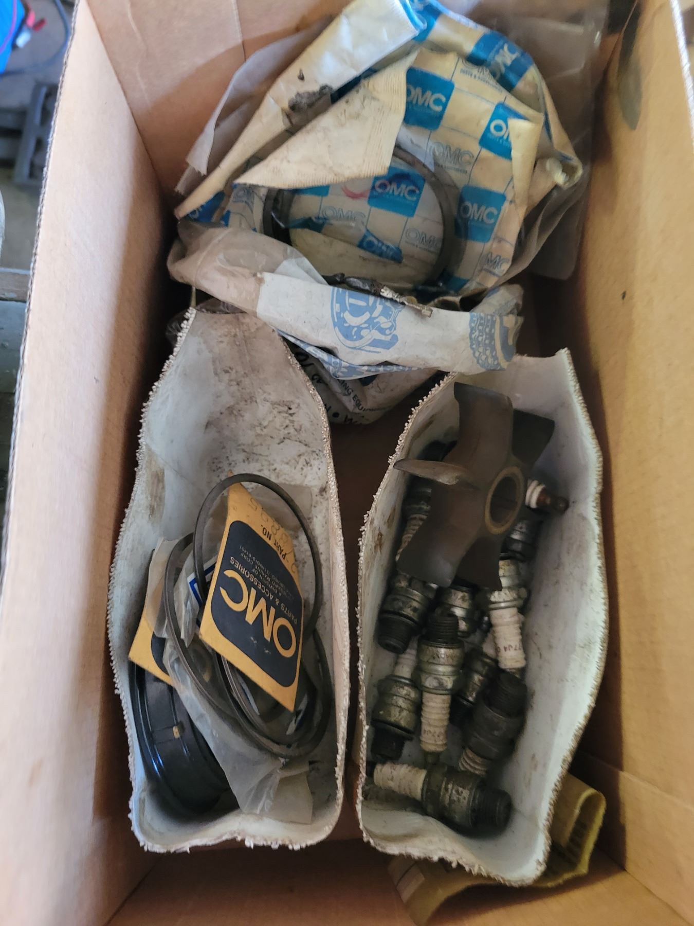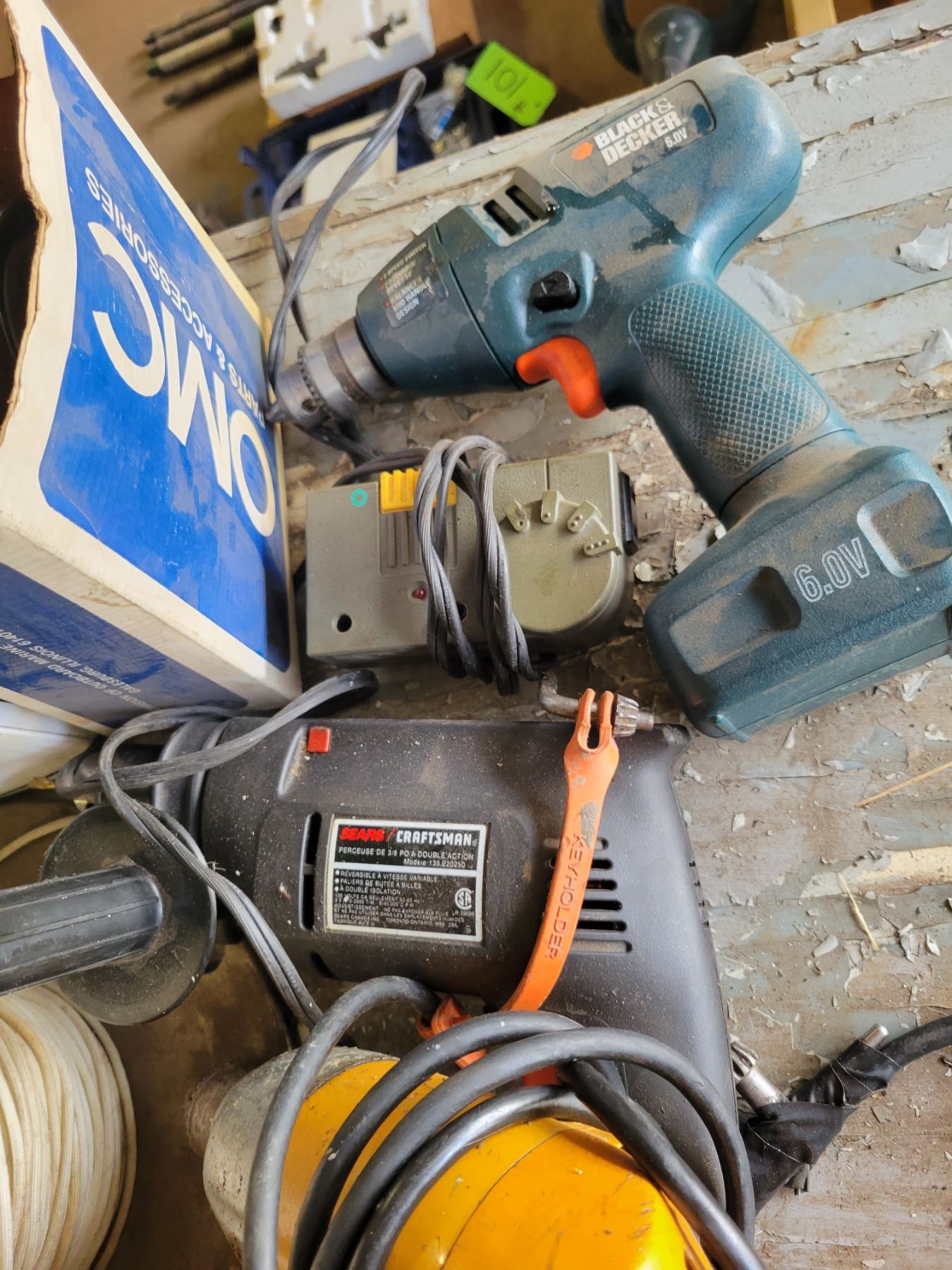 OMC Outboard engine parts, spool of nylon cords, and misc., 2- elec. Drills and 1- battery operated drill