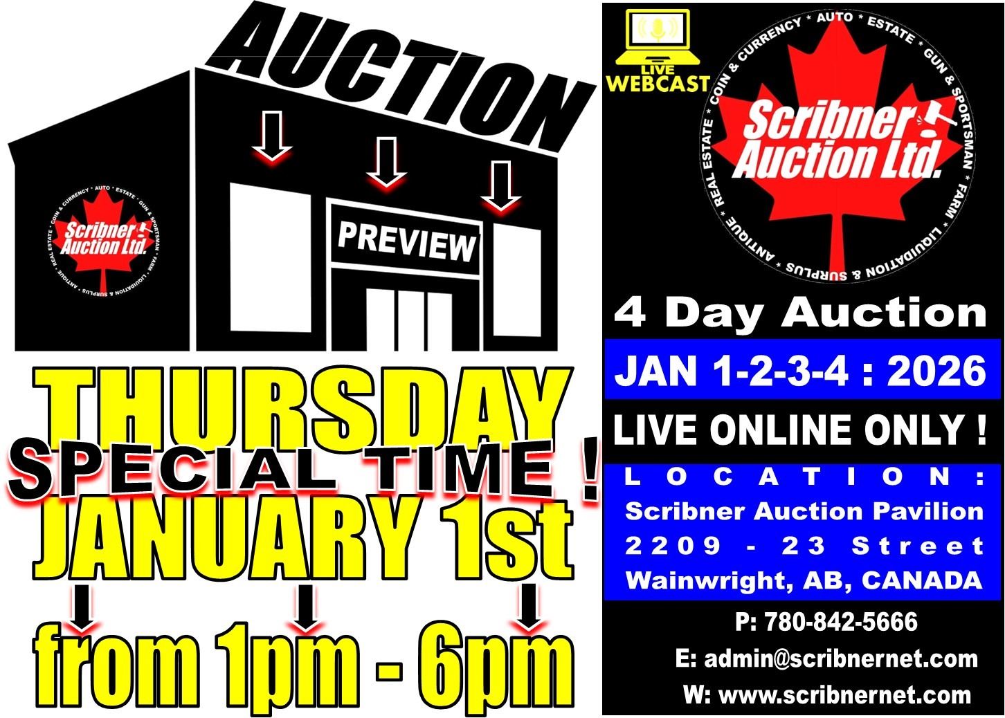 THURSDAY - FRIDAY - SATURDAY - SUNDAY : Purchases will be packaged up after the auction and shipped via Canada Post or PUROLATOR (please let us know which of those 2 Couriers you prefer) within 12-16 days of the auction sale. IF CANADA POST IS ON STRIKE we will be using Purolator. Purolator has offered us great rates competitive with Canada Post in some cases even better depending on location. Please contact us via email (reception.scribnerauction@gmail.com) or call 780-842-5666 prior to the auction if you wish to arrange alternate shipping. Shipping & Handling Charges will be charged to your credit card at the time of shipping. Most packages shipped via Canada Post come with $100 insurance. Please review Canada Post Terms & Conditions & Purolator Terms & Conditions for their respective Insurance Policies. If you want EXTRA Insurance from the carrier, you must instruct our office to purchase additional insurance! Scribner Auction Ltd. will not be responsible for any damage or breakage to any item for any reason (shipping, handling or otherwise). If you wish to arrange for Pick Up at our Wainwright, AB location, please call our office to make an appointment 780-842-5666. You MUST schedule an appointment (NO DROP INS PLEASE!)