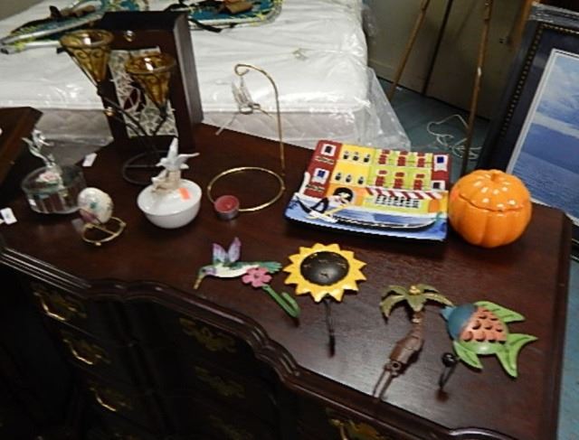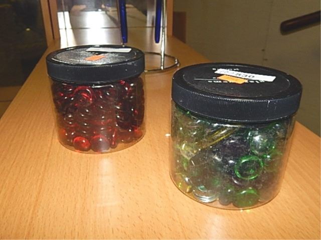 ORNAMENTS - 12 PC -AND JARS OF COLORED GLASS