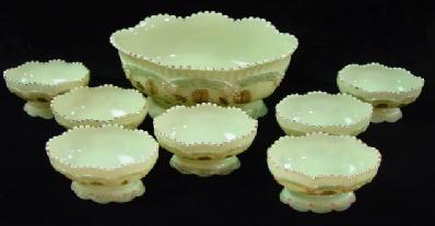 10 5/8" long in the "Chrysanthemum Sprig" pattern, signed "Northwood", together with seven matching oval footed sauce dishes, each also signed: "Northwood", American, early 20th C.