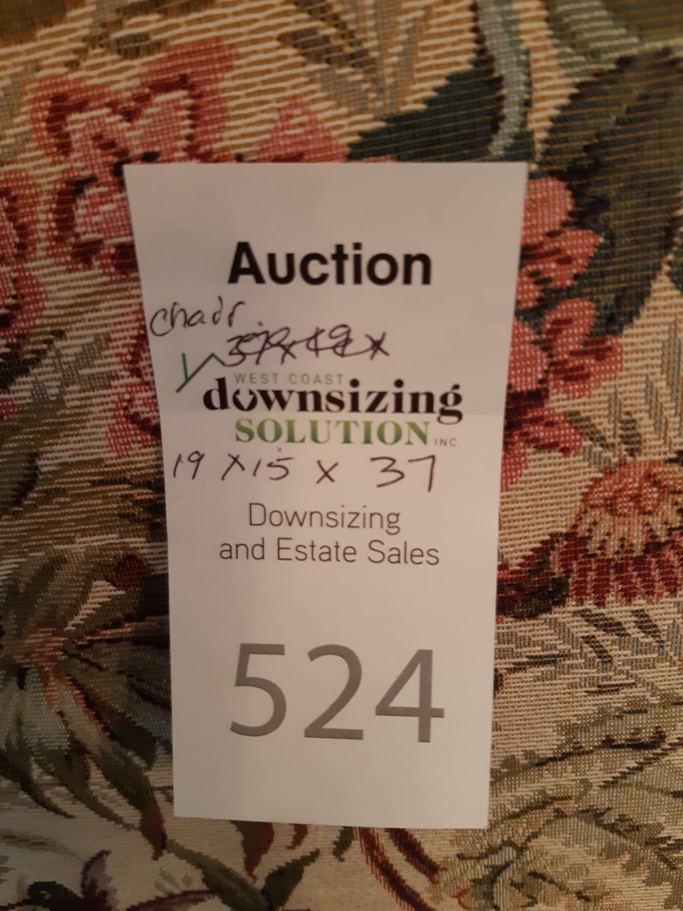 Arm chair with barley twist details, hummingbird tapestry fabric. 19x15x37. Pickup at 11:30 am