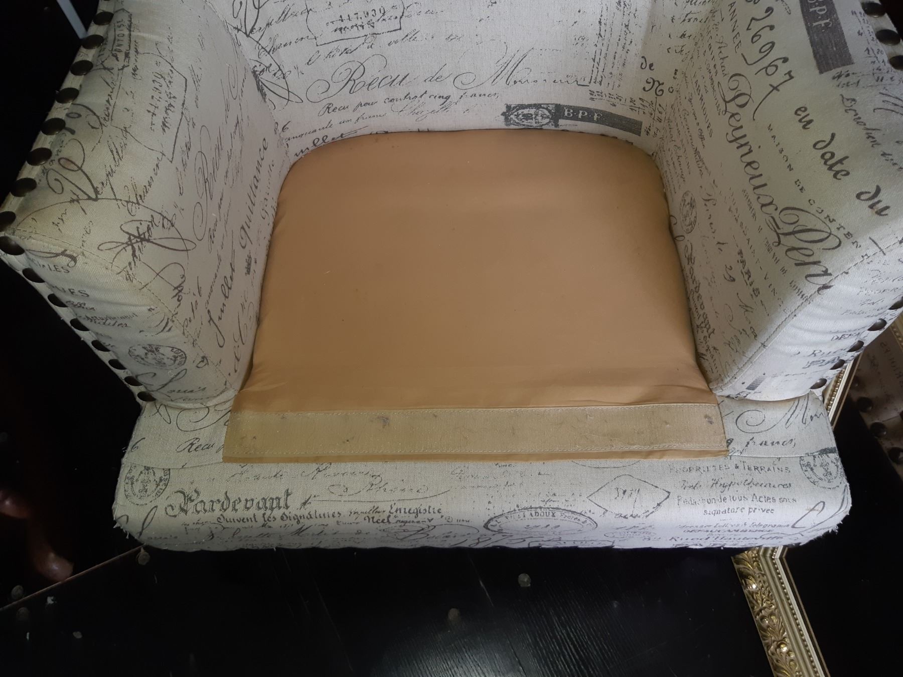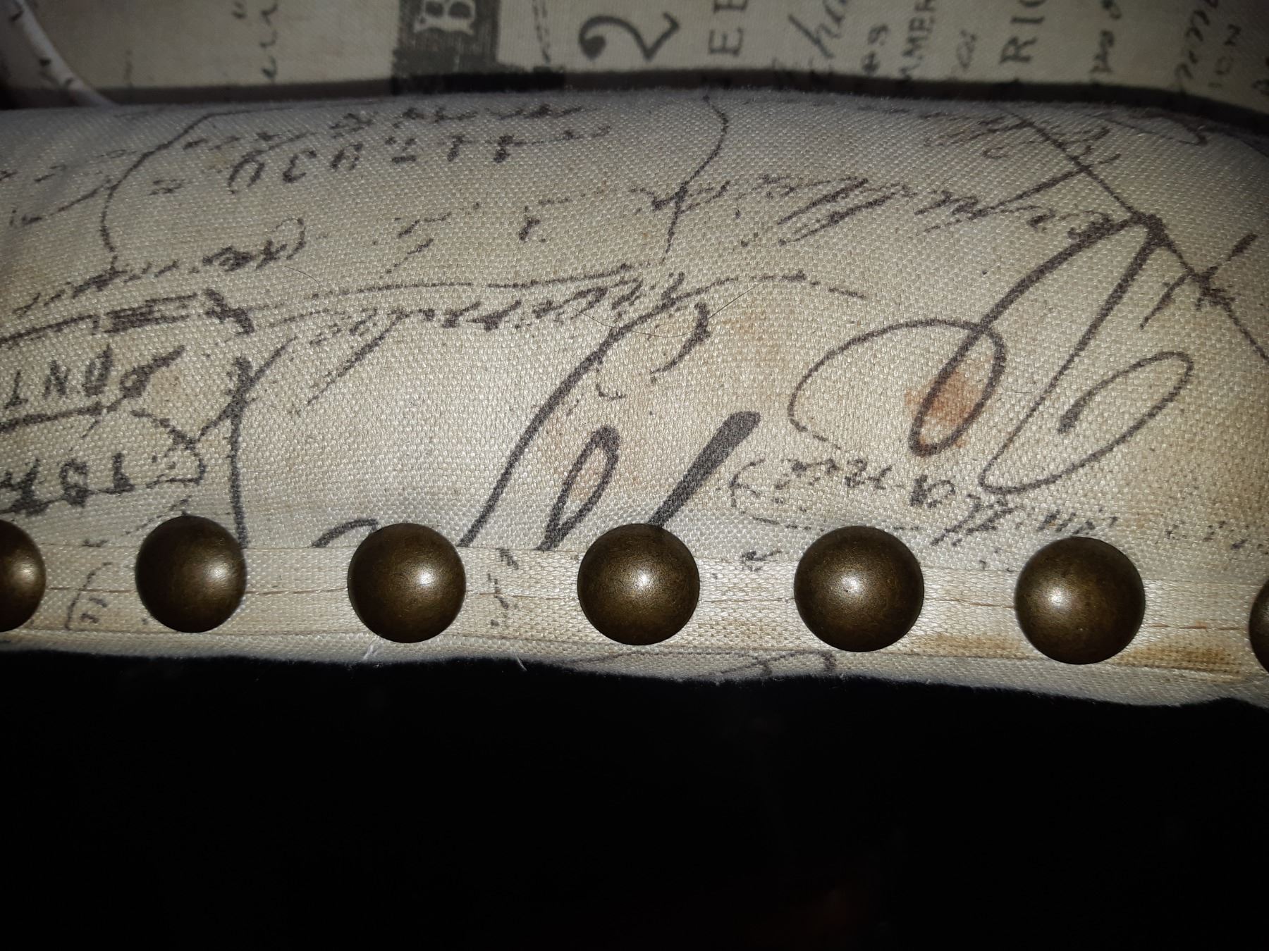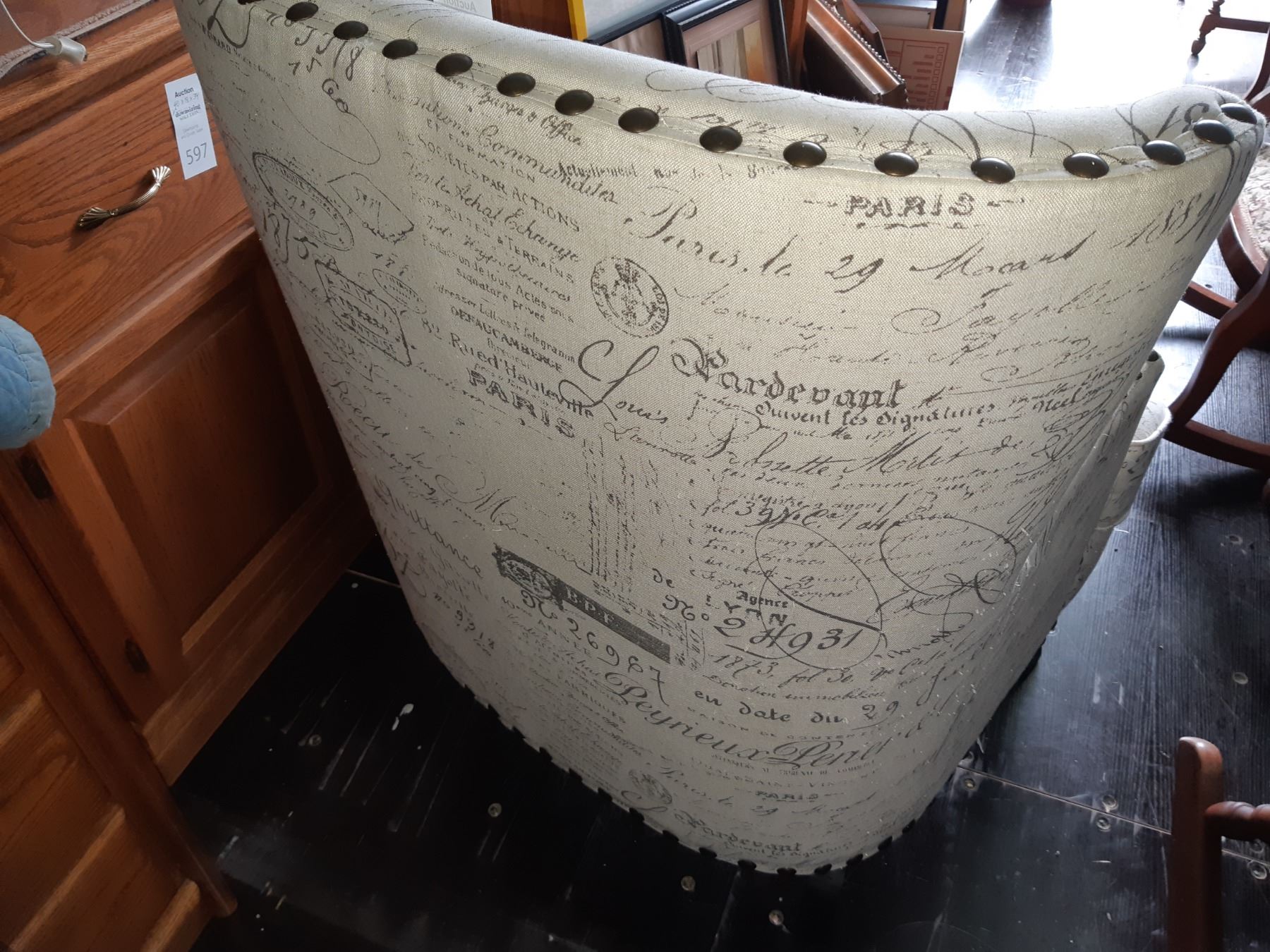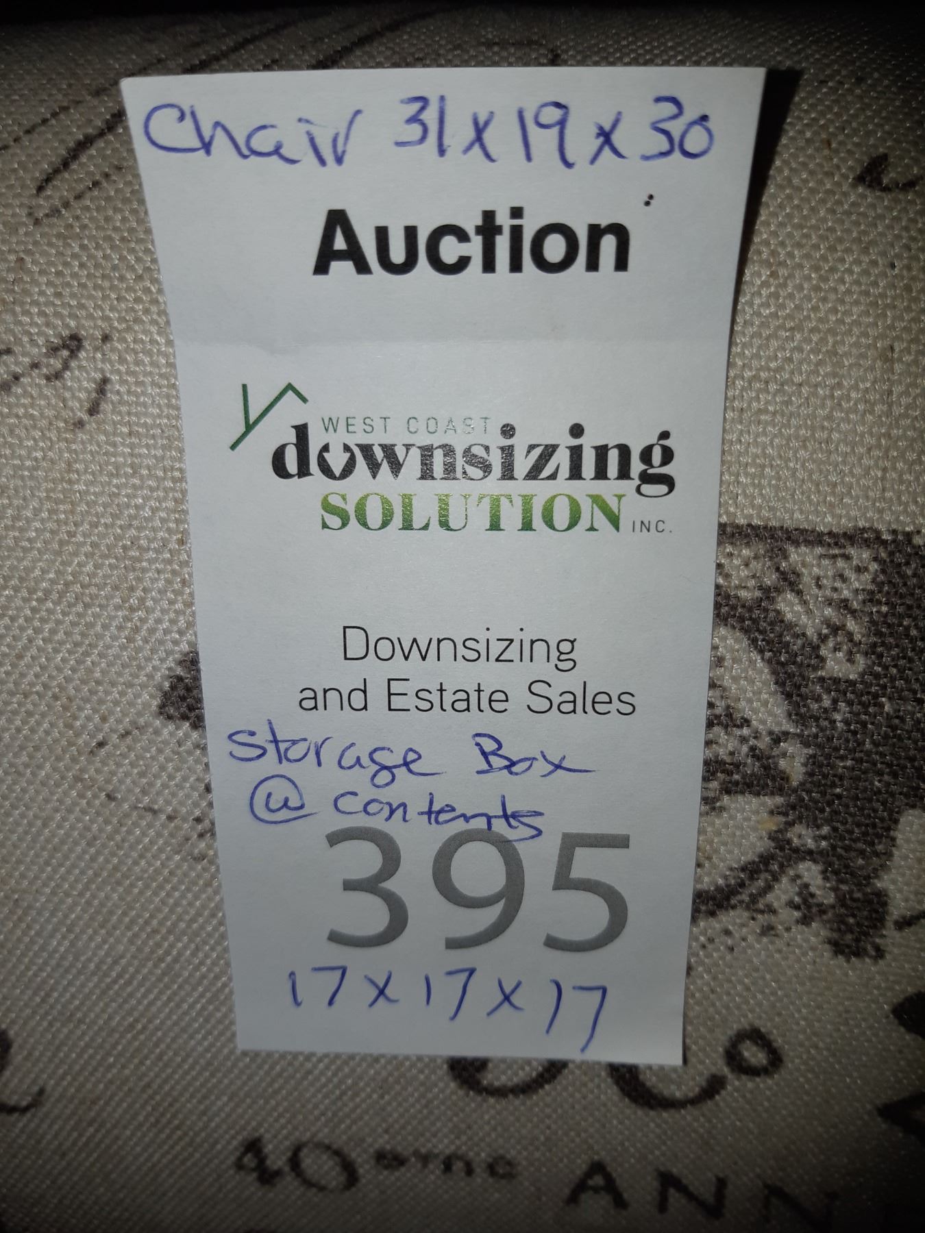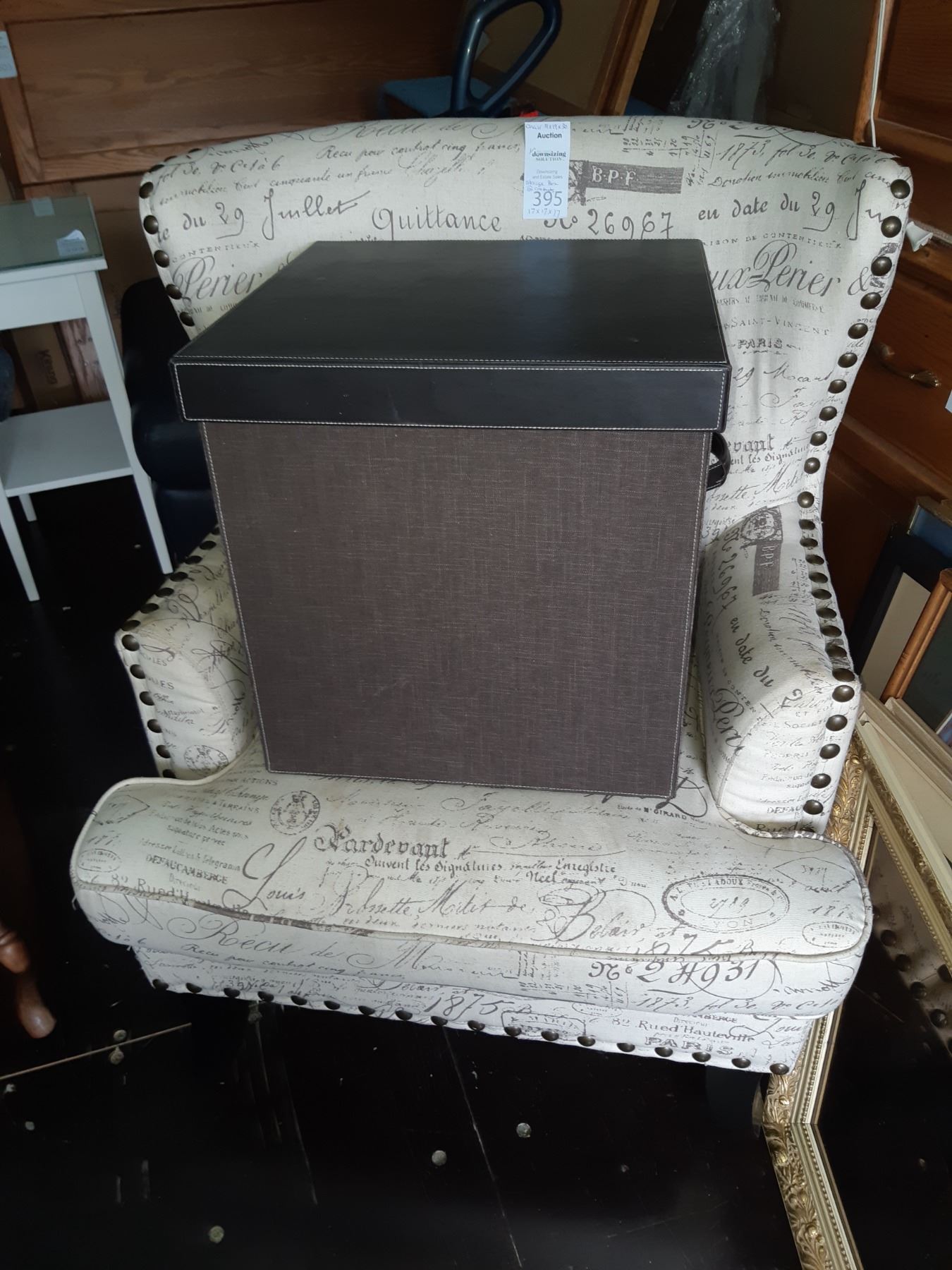 Decorative occassional chair with studded arms. Removable zippered cushion, note stains 31x19x30. Storage box includes table linens, place mats. 17x17x17. Pickup at 11 am