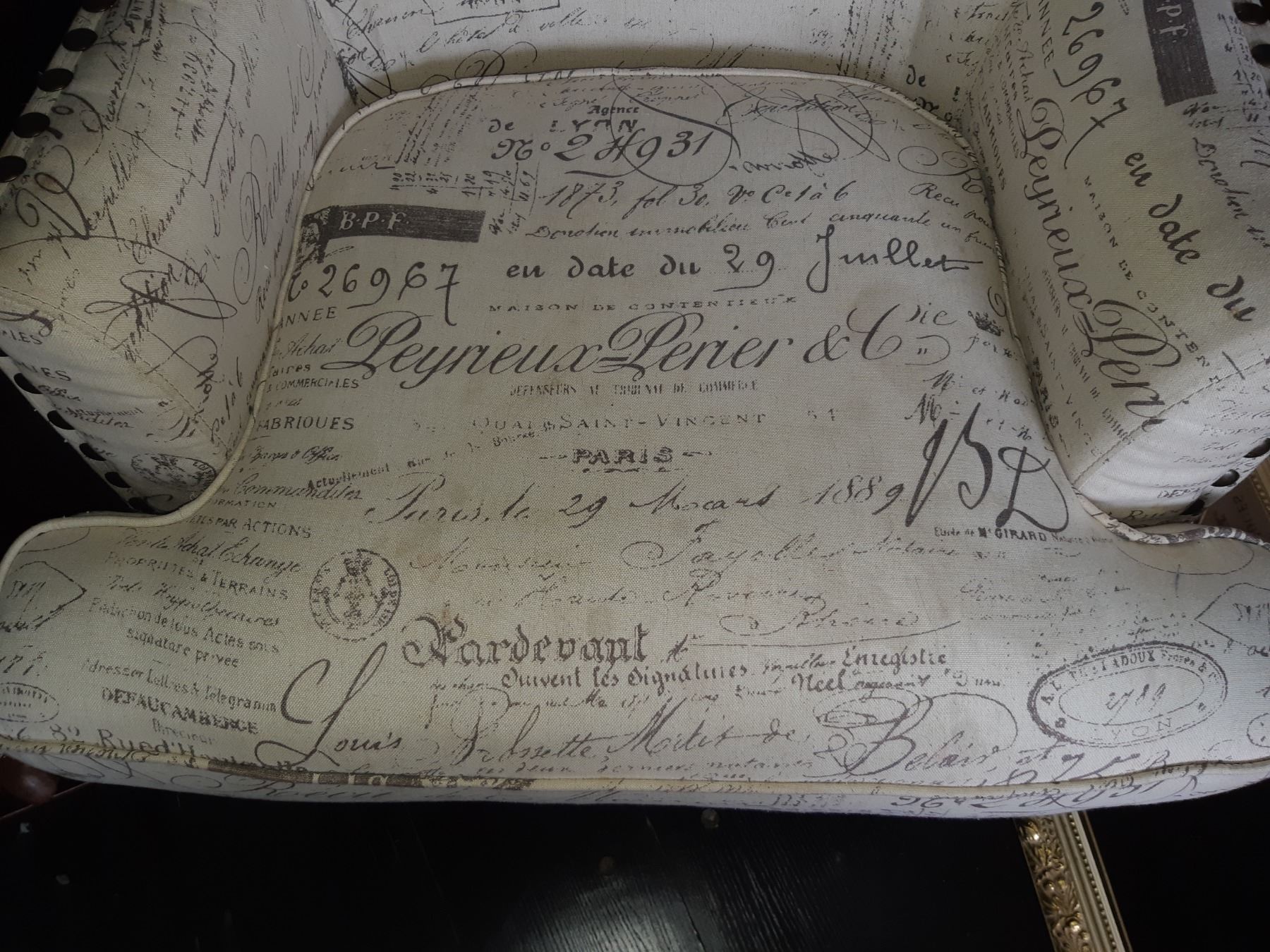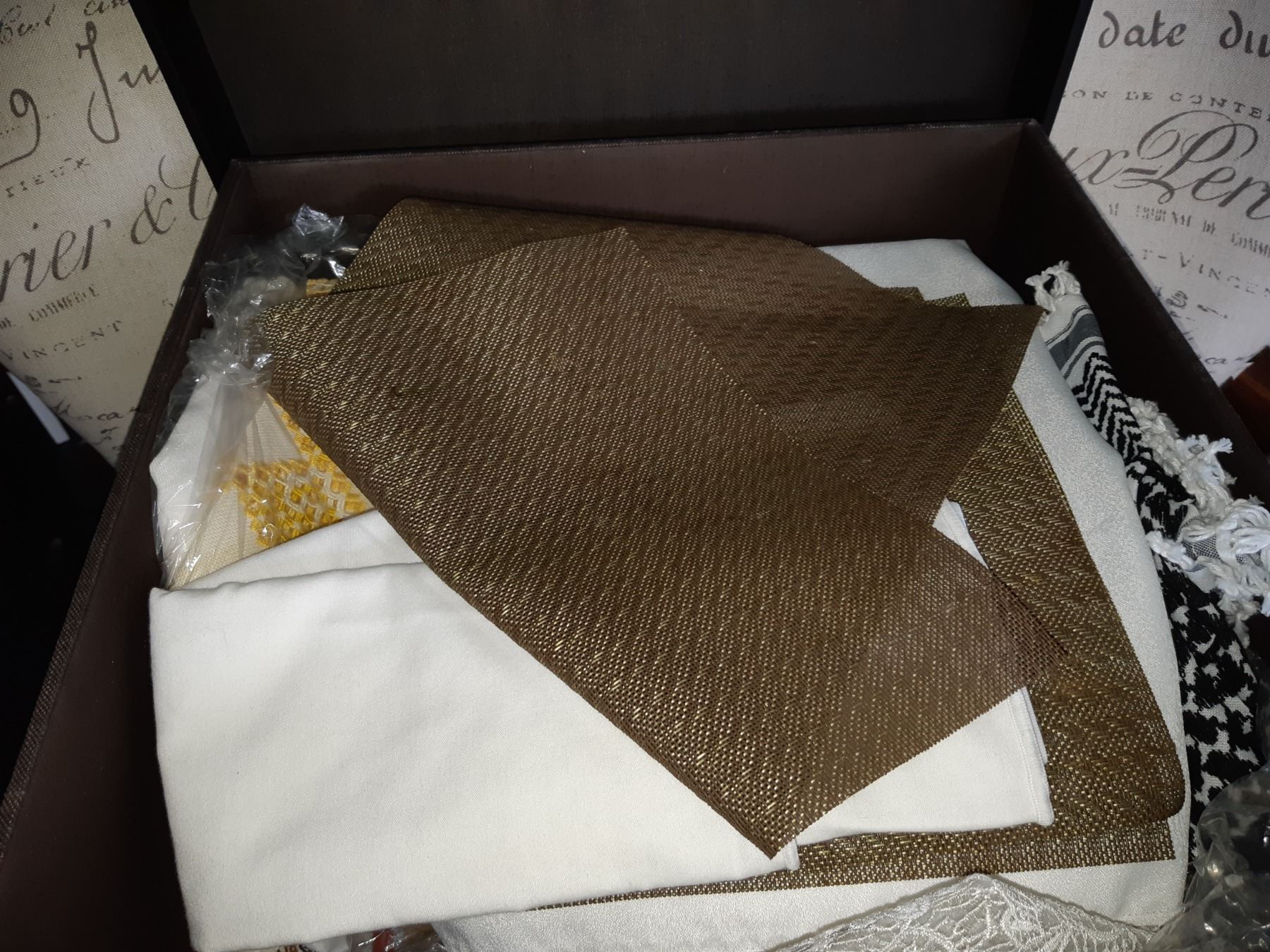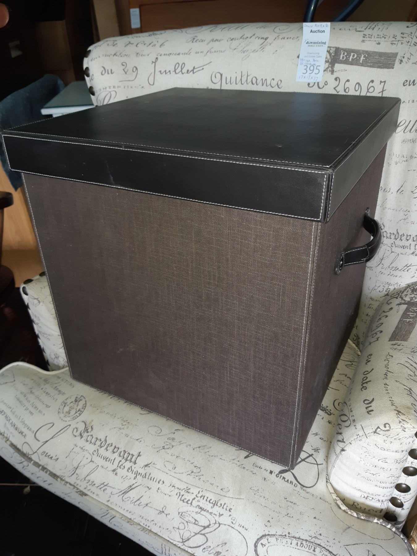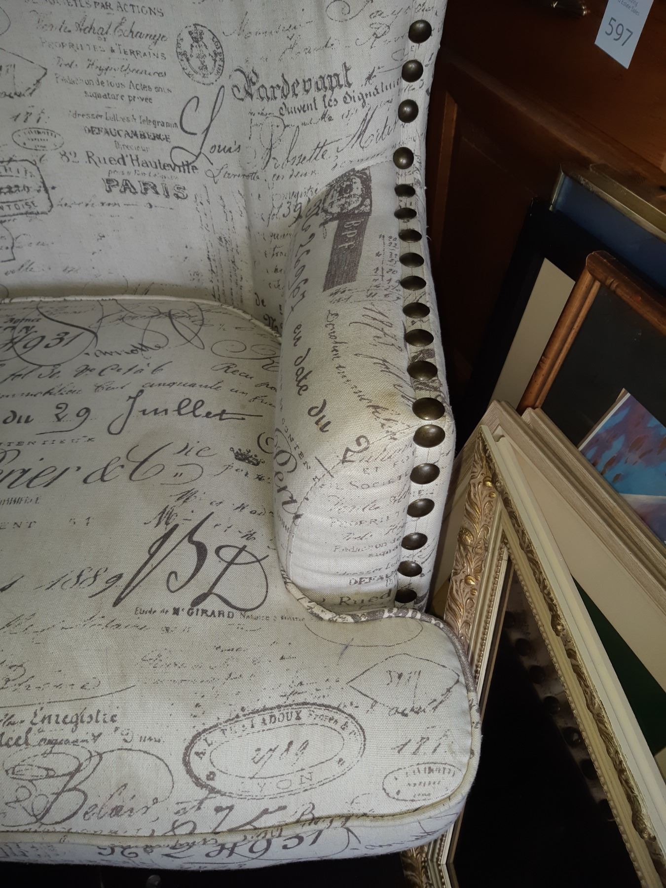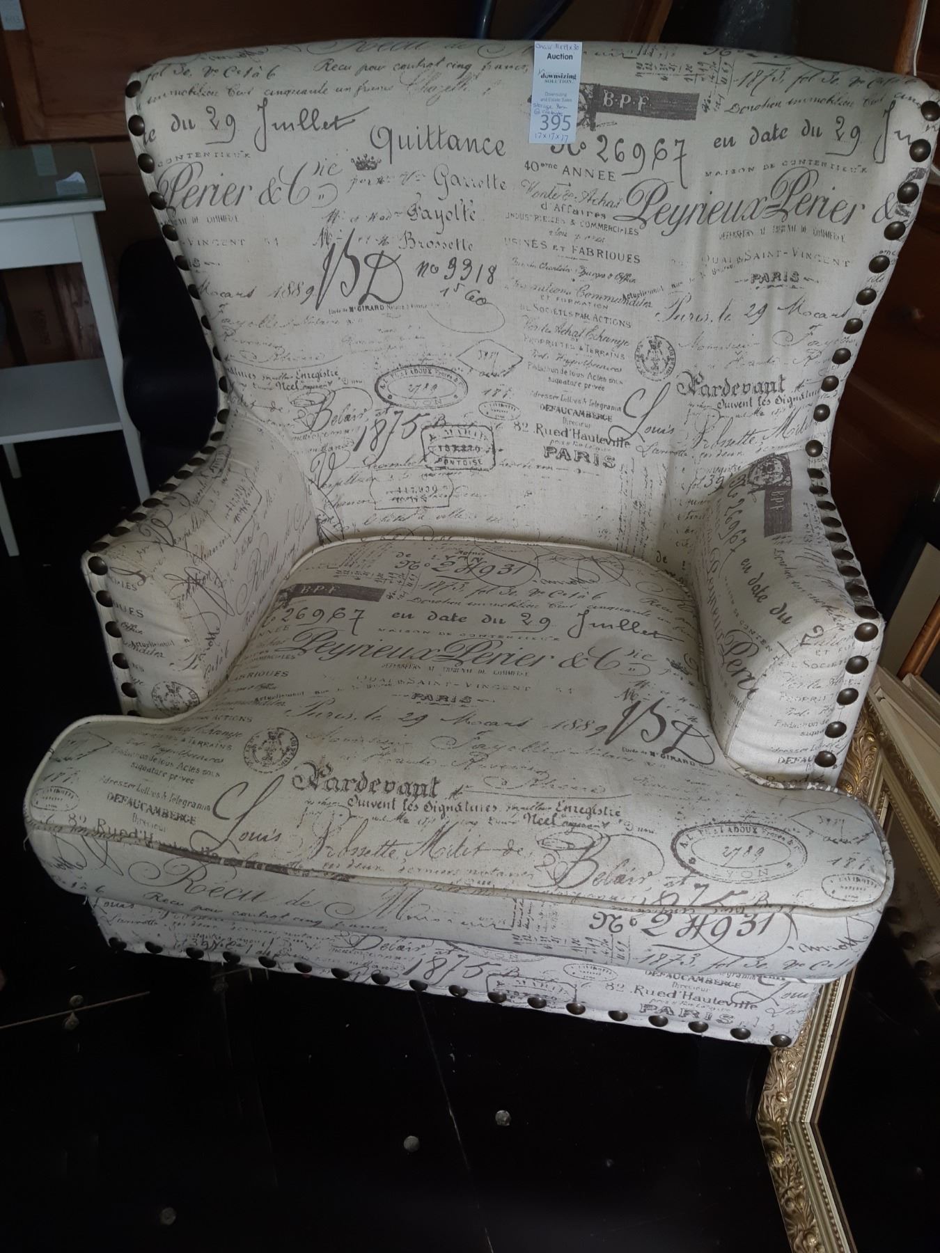Decorative occassional chair with studded arms. Removable zippered cushion, note stains 31x19x30. Storage box includes table linens, place mats. 17x17x17. Pickup at 11 am