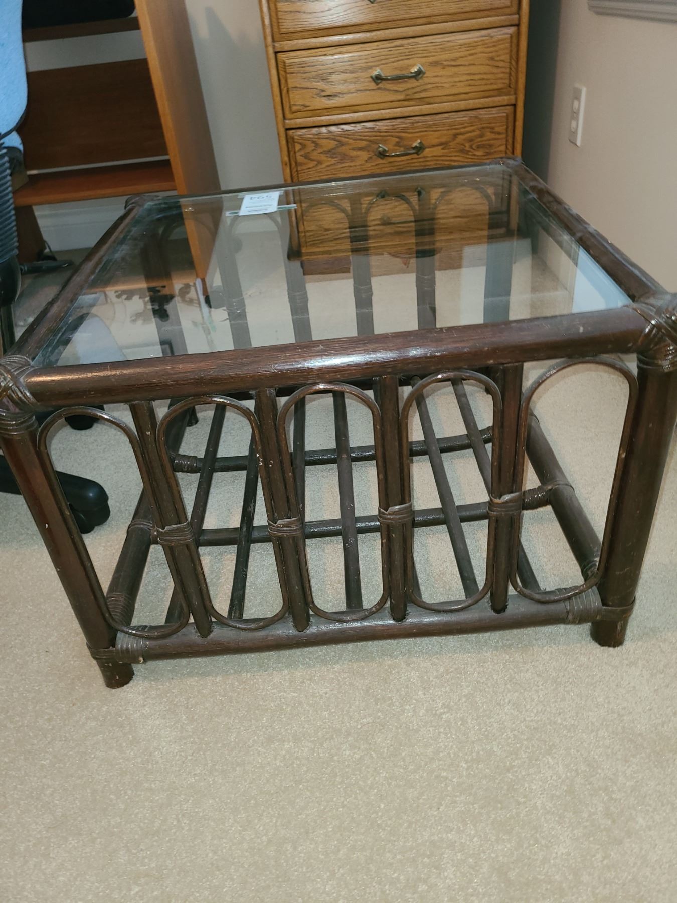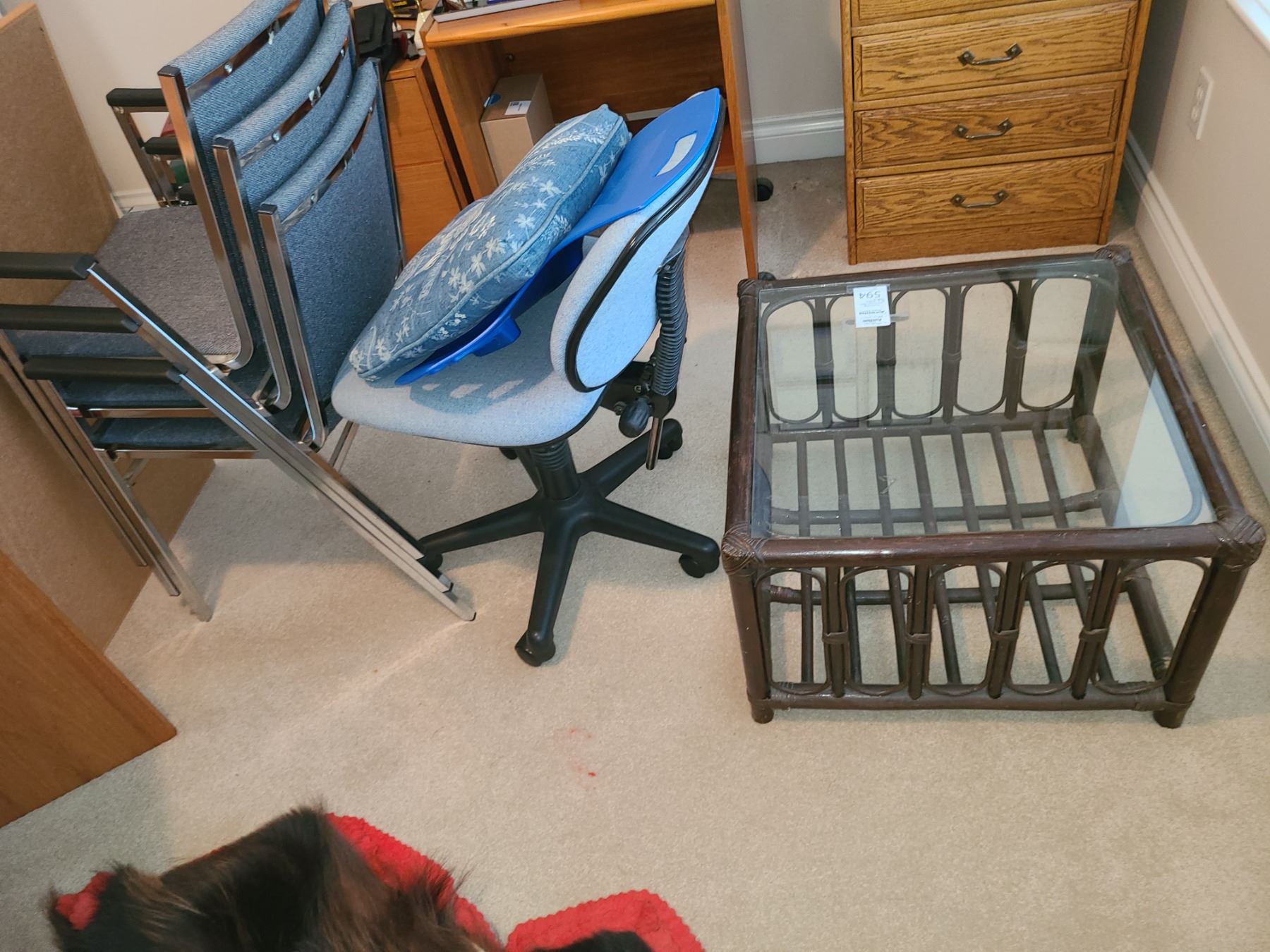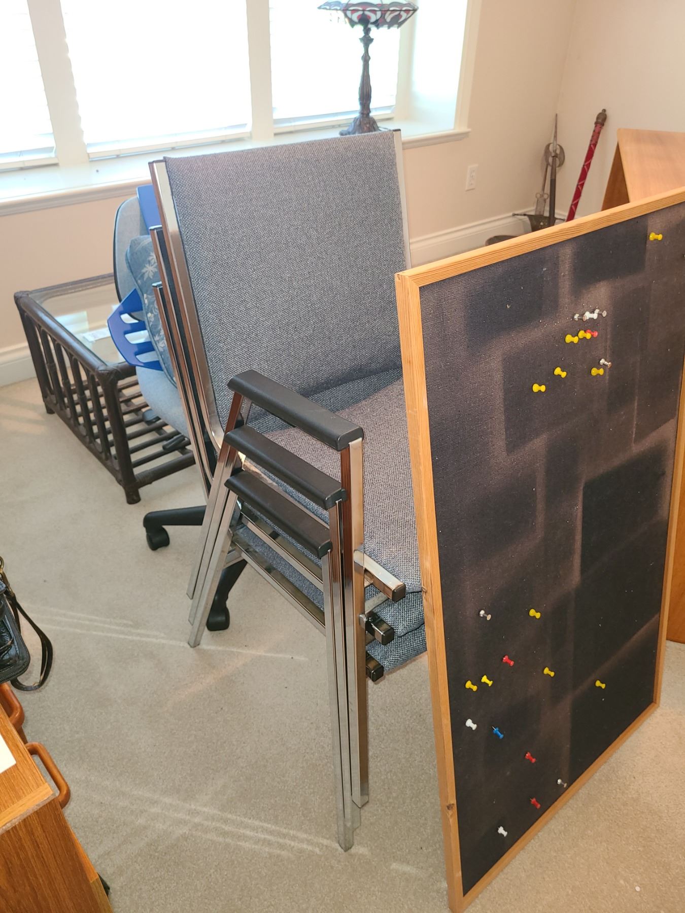Three stacking office chairs, single chair, rattan table, and bulletin board. Bring help to move. Pickup 11 am.