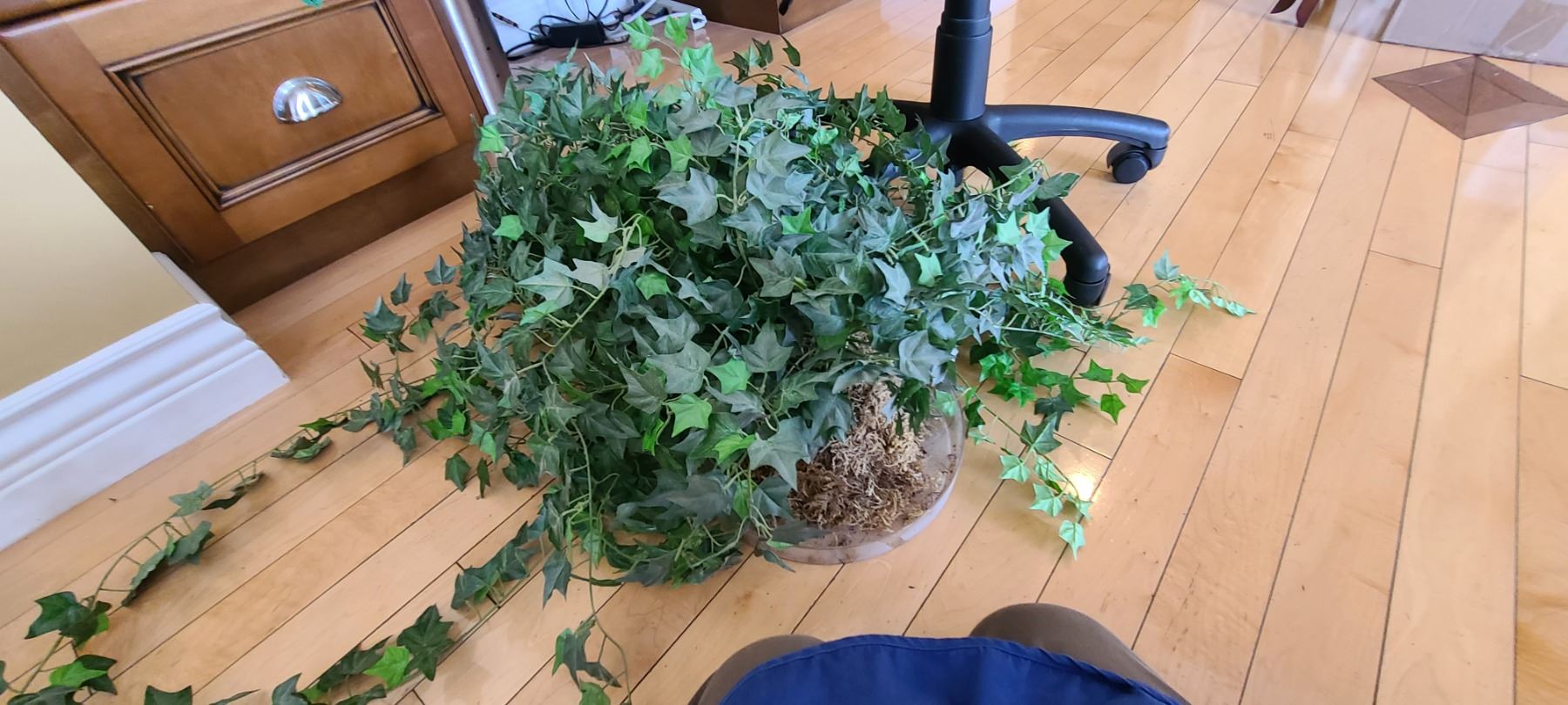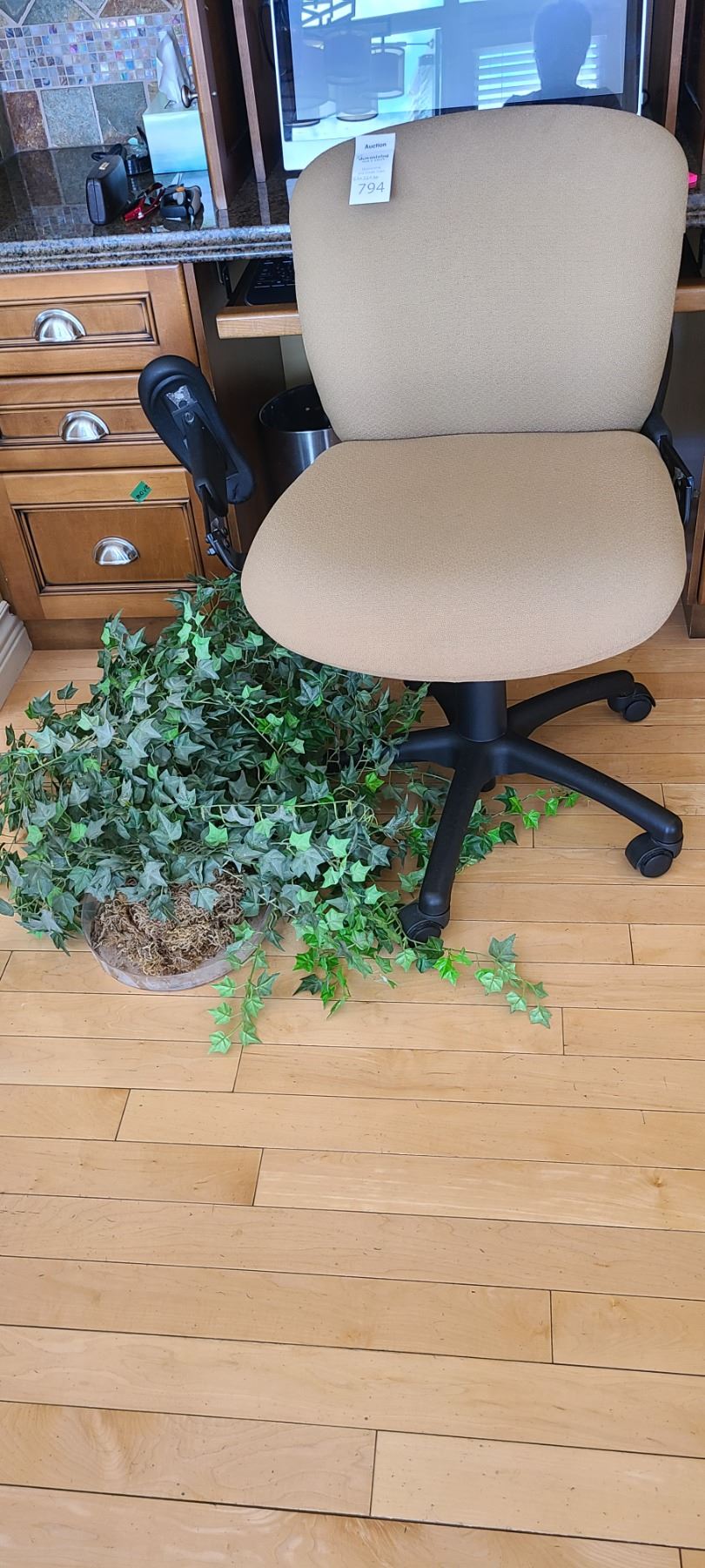 Office chair with fold down arm rests 19x19x36 and artificial plant. Pickup at 11 am