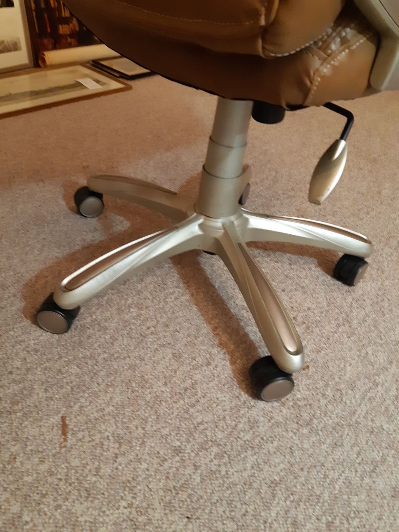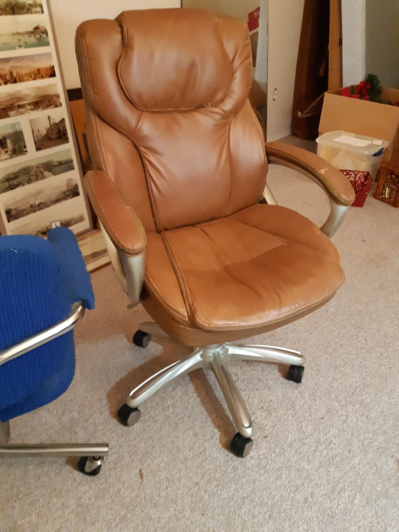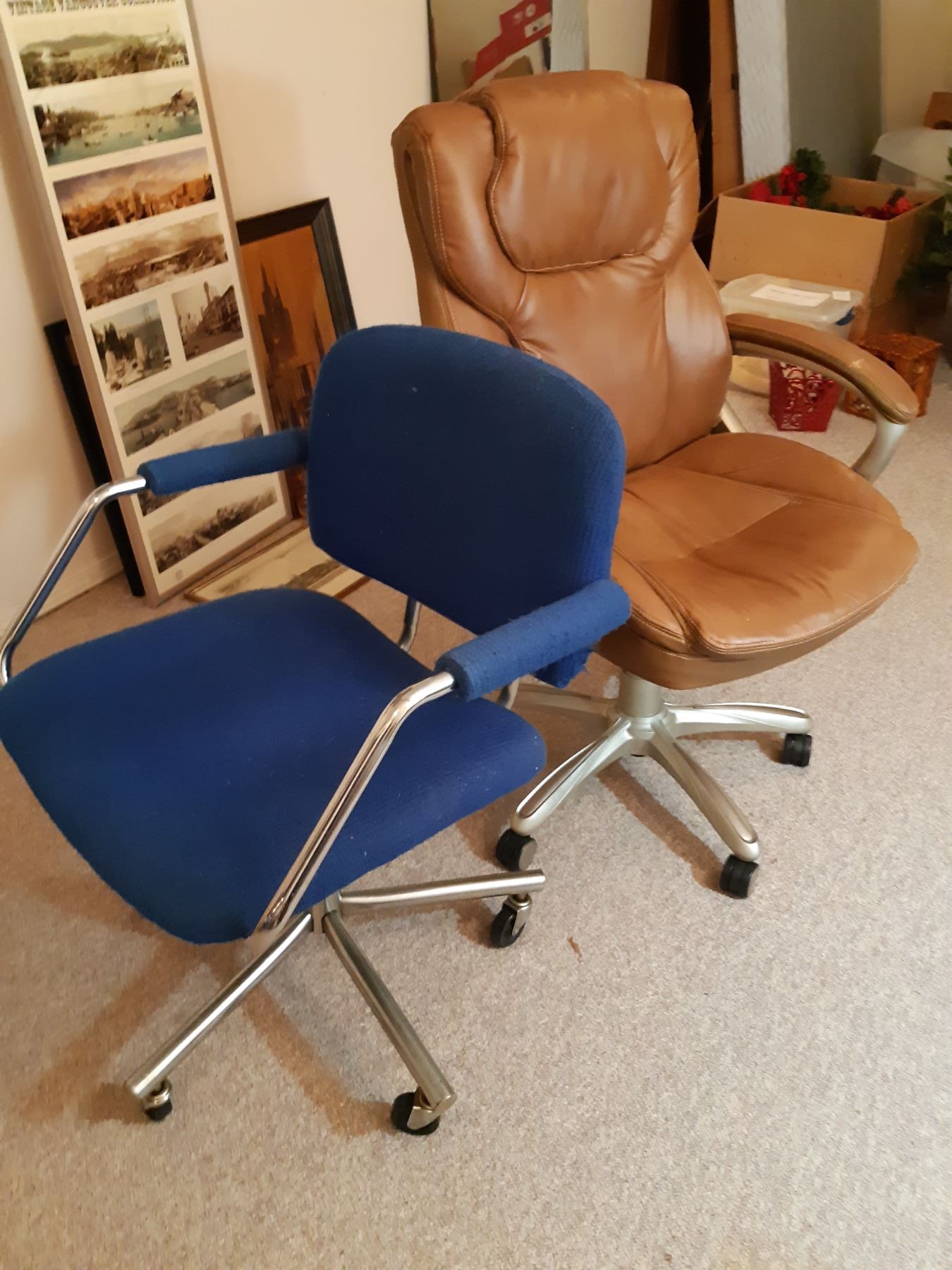 Faux leather swivel chair 39" high, note wear on arms. Vintage blue fabric chair, pickup at 2 pm