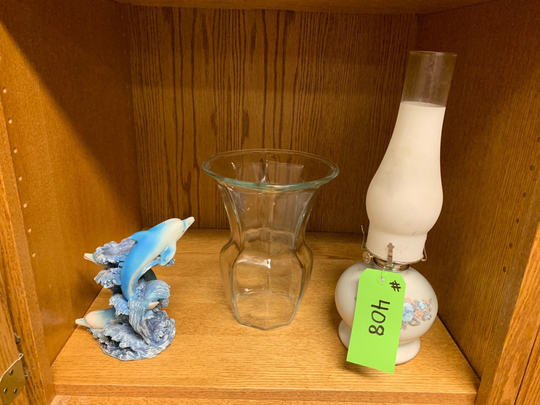 Oil lamp, glass vase & ceramic dolphin figurine