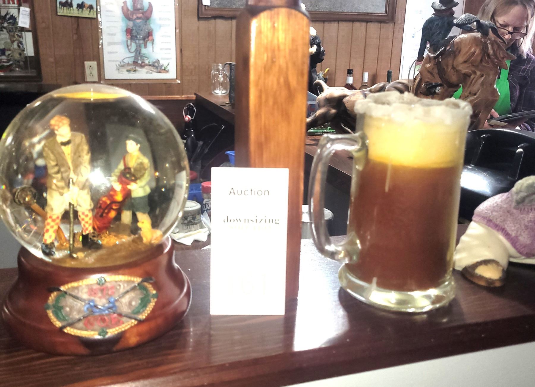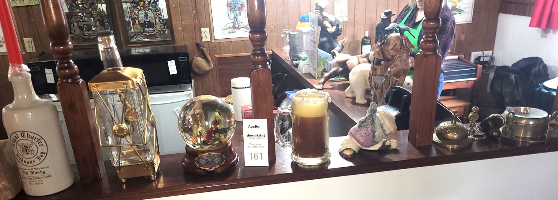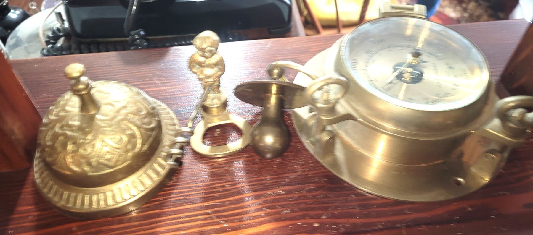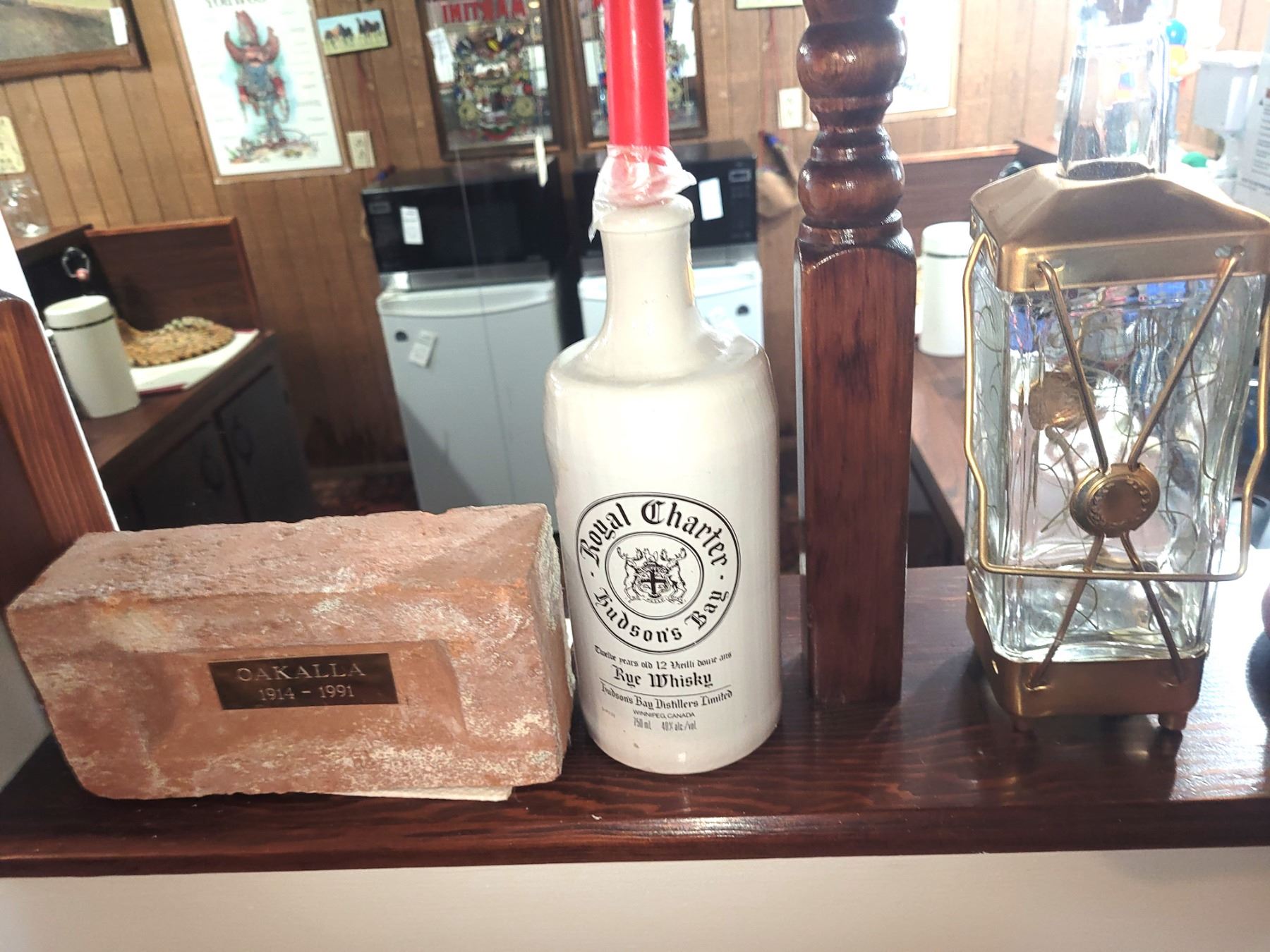 Brick from Okalla prison, golf musical snow globe, musical lantern, mug candle, Hoot family golfer, brass items.