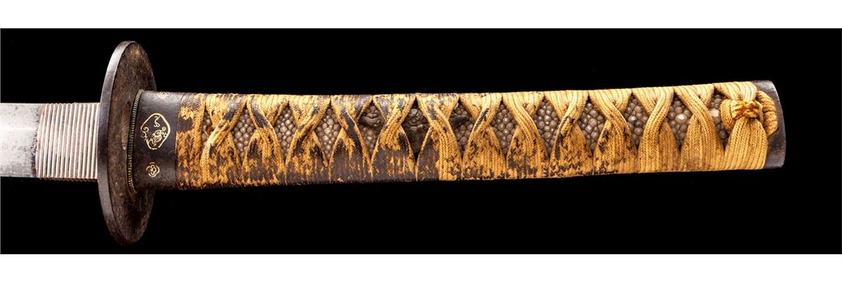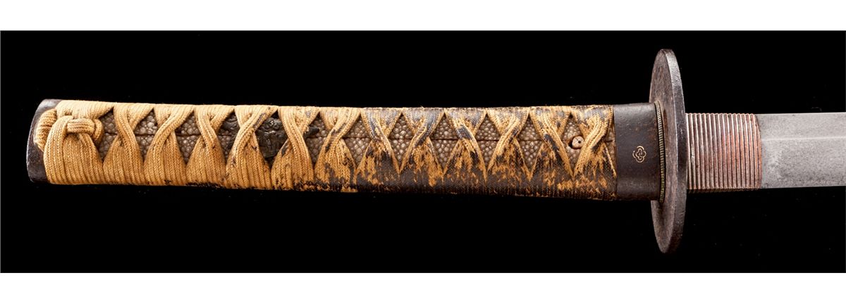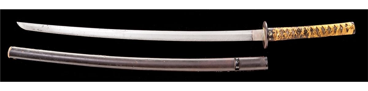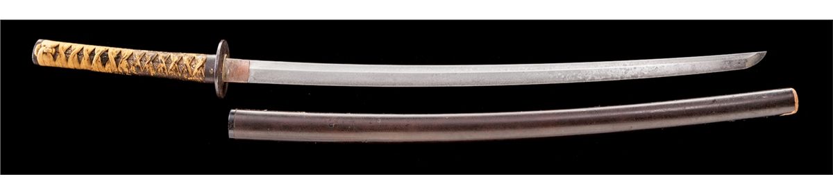Old Samurai Katana Sword, 26-1/2'' hand-forged blade with irregular temper line, appears to date to the Shinto period, ca. 1650. Unsigned tang with two mounting holes. Matching gold and iron fittings on handle with matching tsuba guard. Dark brown lacquered scabbard is missing the bottom fitting. Condition is good with light rust patina overall. Minor losses to scabbard finish at spine. Est.: $1,200-$1,800.