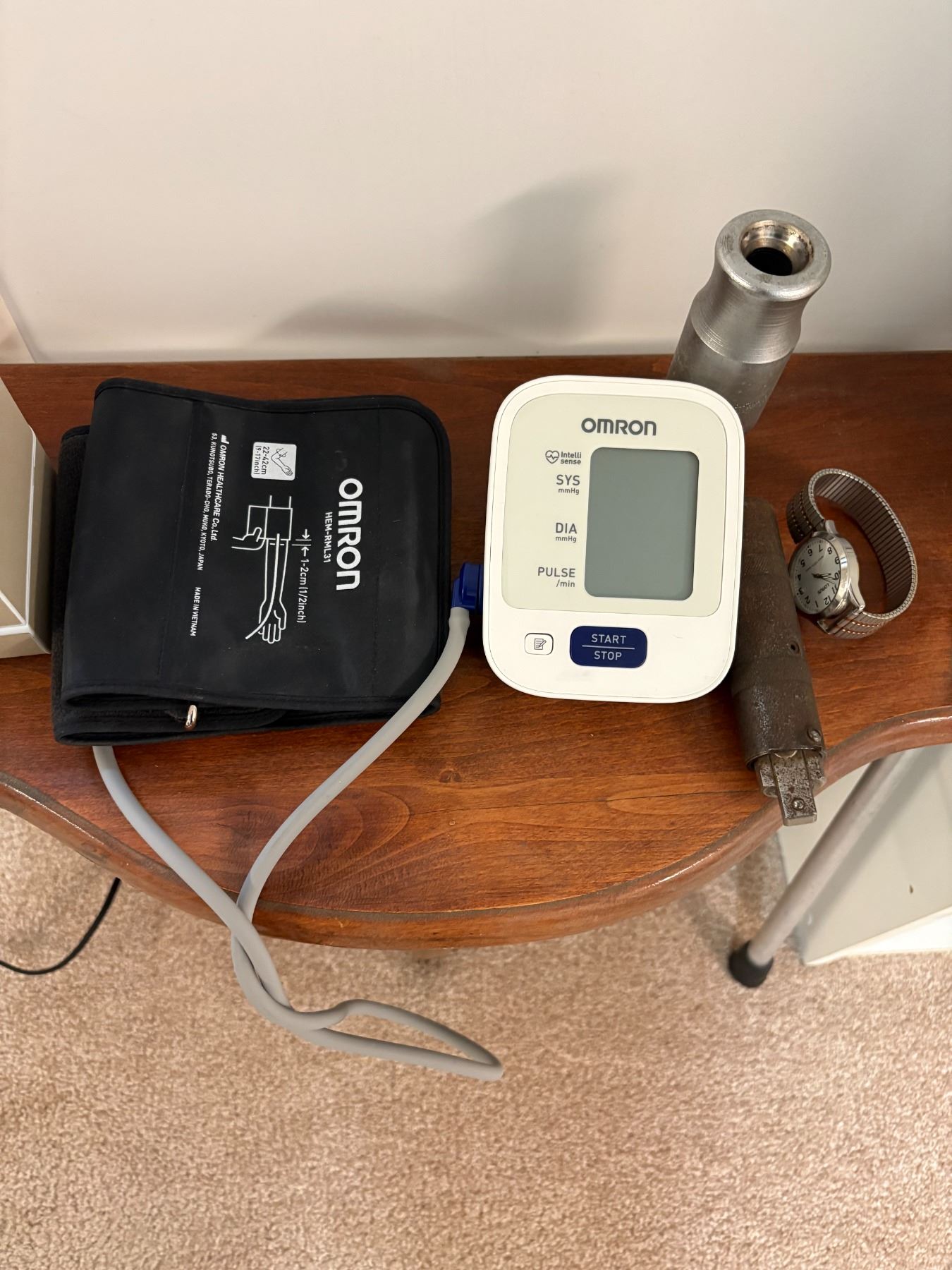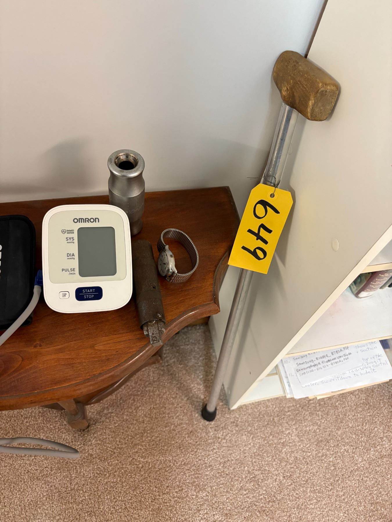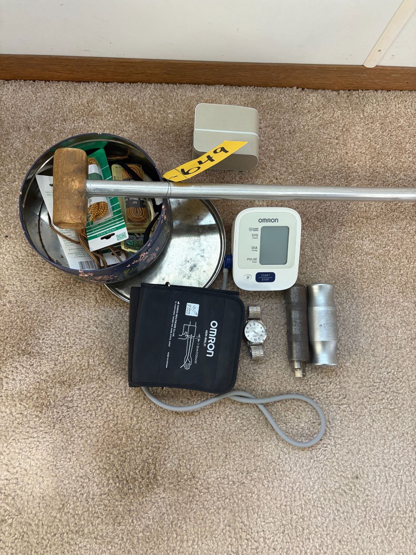 Omron blood pressure machine, watch, tin of shoelaces and misc.