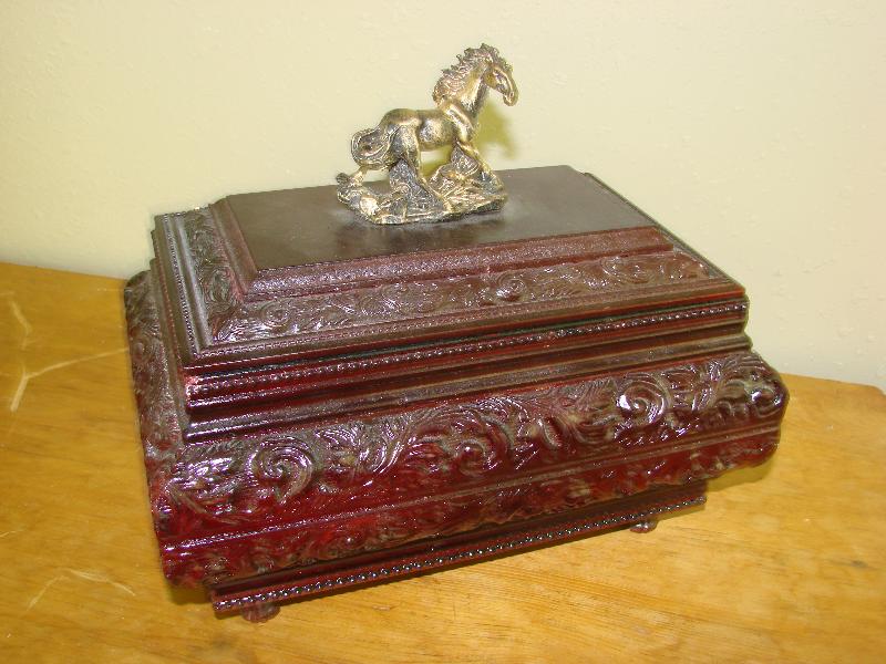 Ornate wood box,horse head top,black velvet lined,apprx.7"x11"
