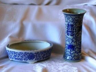 (2 pcs) Oriental Designer Blue & White pottery; 10 1/2" Vase & 10" Oval Footed Bowl