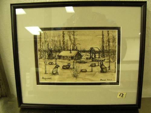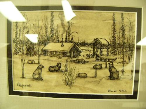 Original George Ahgupuk drawing on moose skin 3.75"x5.75" of cabin, cache, and dog team circa 1951