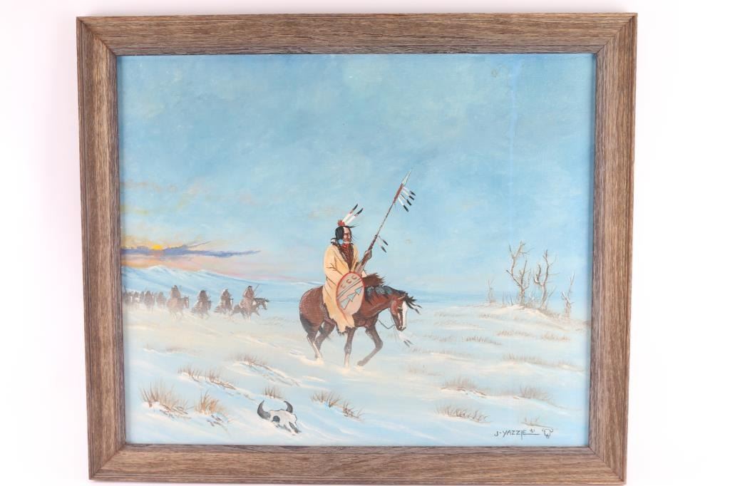 Johnny Tso Yazzie (1945-2021) was a Navajo Artist and resident of Albuquerque, New Mexico. Yazzie was a major contributor to the popularity and growth of contemporary Native American painting. He received his education at the Tuba City Boarding School and later the Sherman Institute in Riverside, California. Later, Johnny Yazzie moved to Santa Fe where he attended the Institute of American Indian Arts and College of Santa Fe. This painting depicts an indian on horseback in snow leading the tribe. Measures 20" x 23 1/2", in wood frame measures 23" x 27 1/2'. Signed lower right corner.