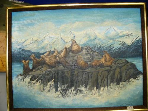 Original oil, 12"x16", on canvas board of seals on haul out, by Julie McIntyre (229)