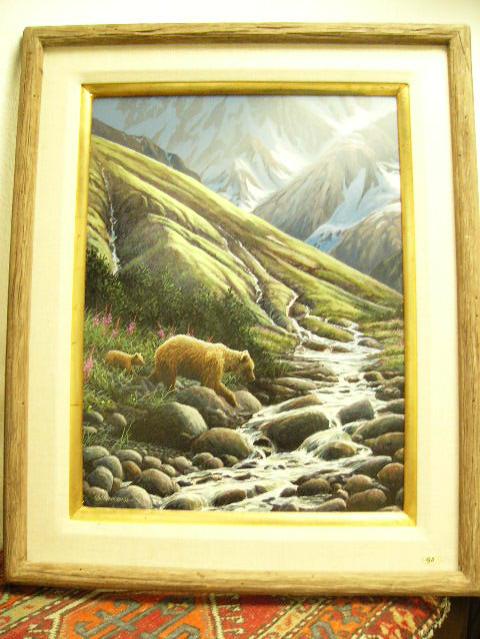 Original oil on Artist board by Gary Peterson 1990 - two bears by a stream beautifully framed 24"x18" (134)