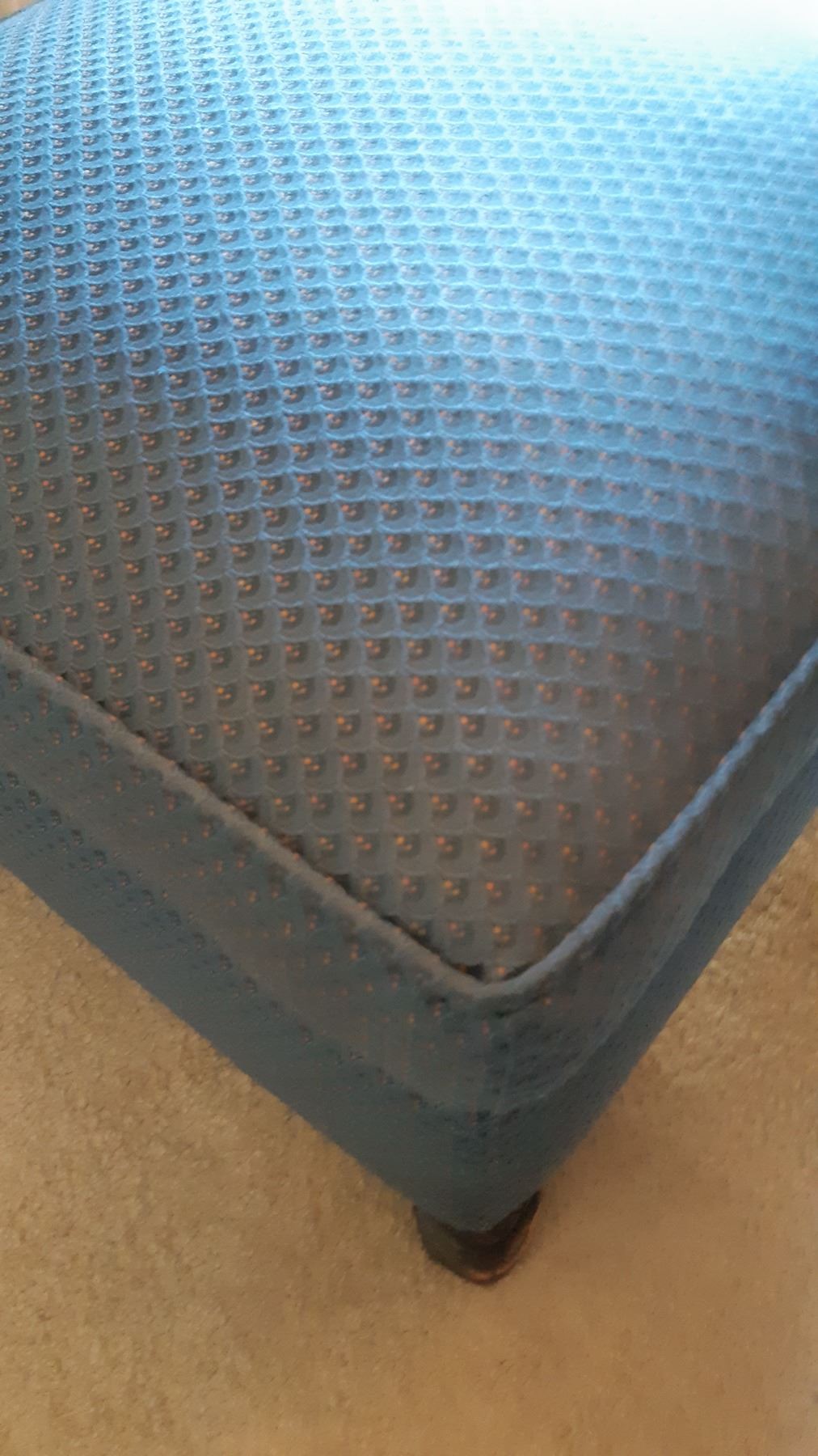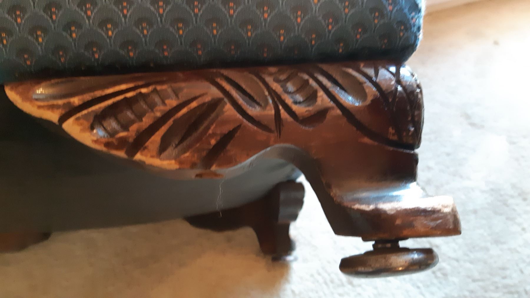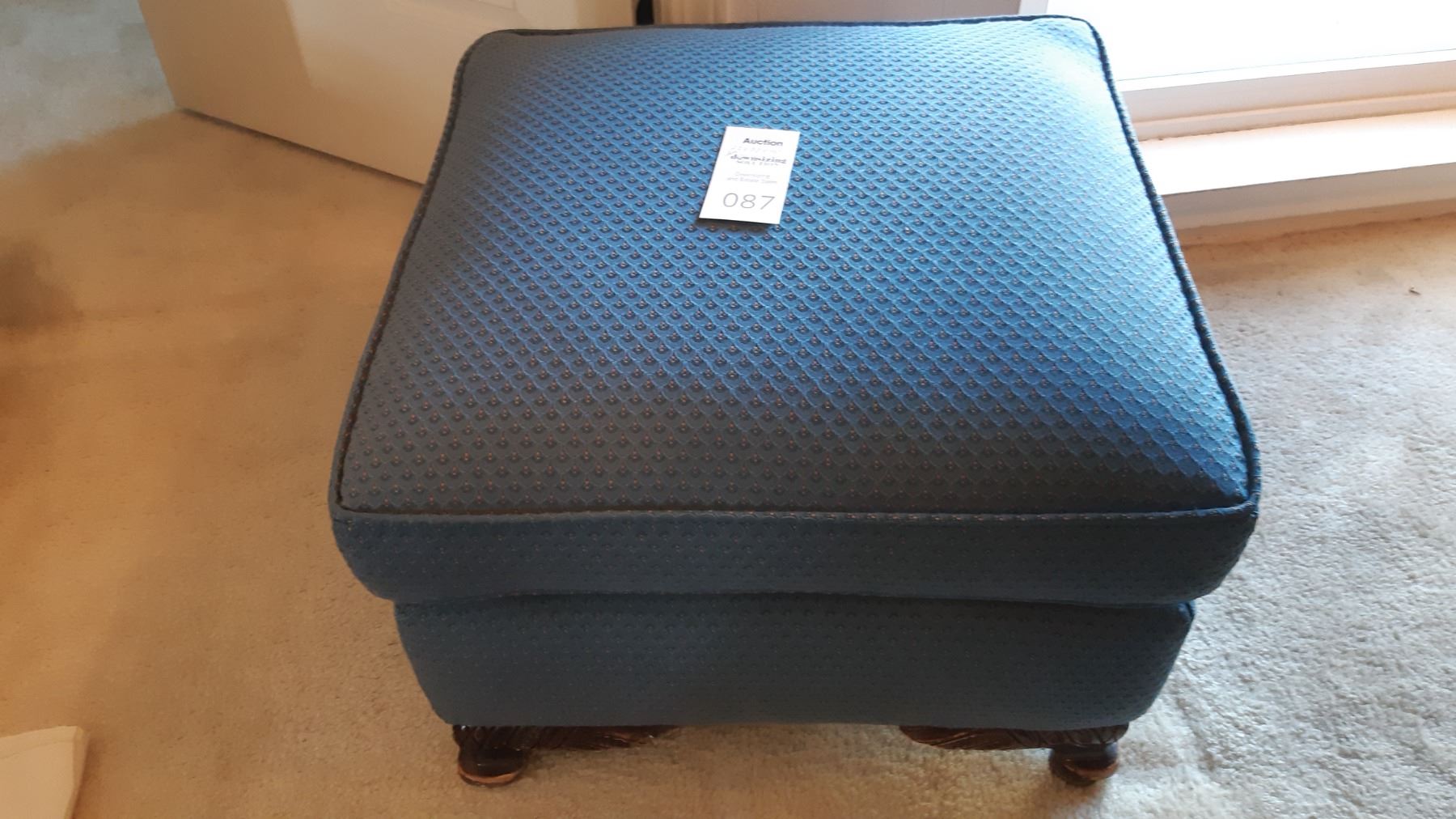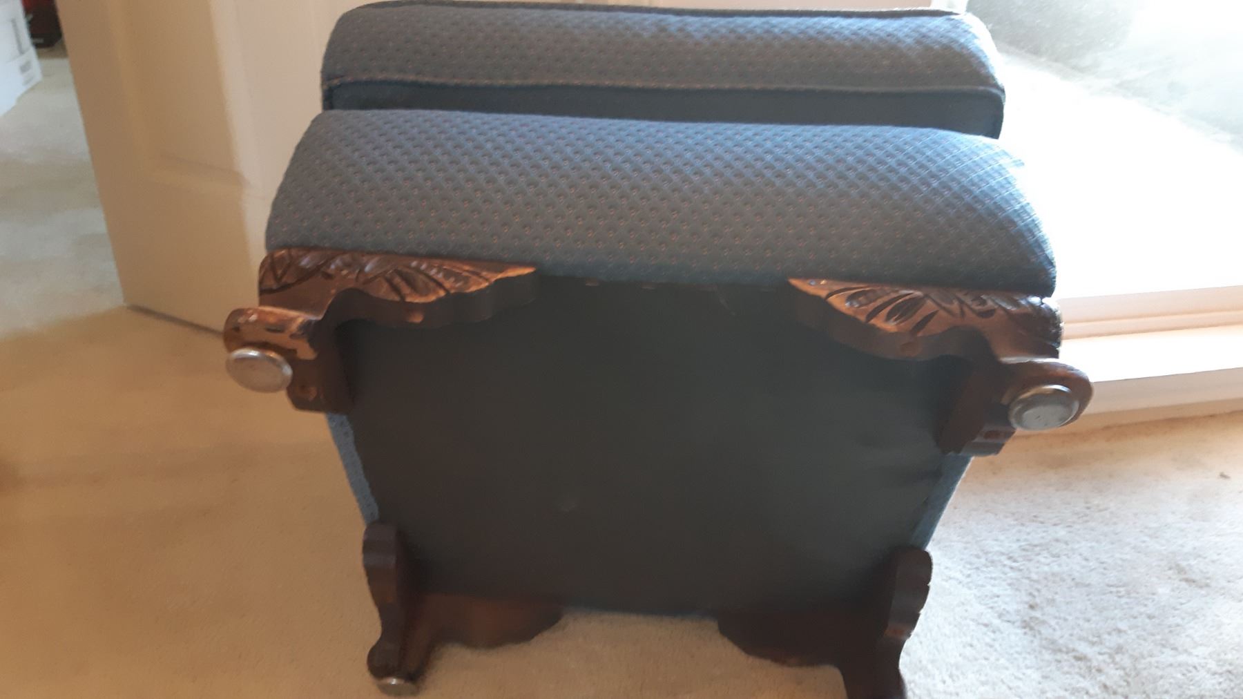 Upholstered ottoman with carved wood feet is 22x22x15. Wear on wood.