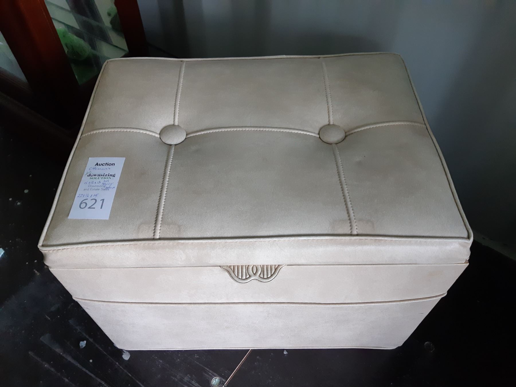 Fabrick covered ottoman with wood footings 15x13x13 includes sewing notions. Vynal covered ottoman 22x16x15 Pickup at 10 am