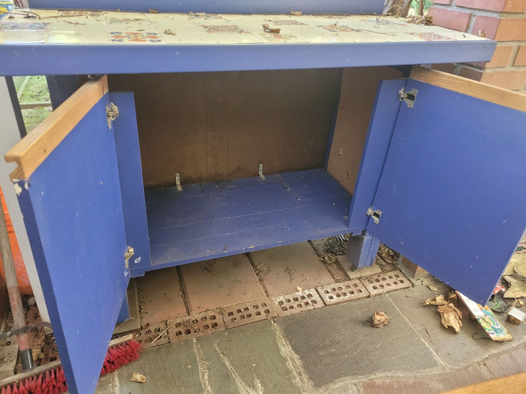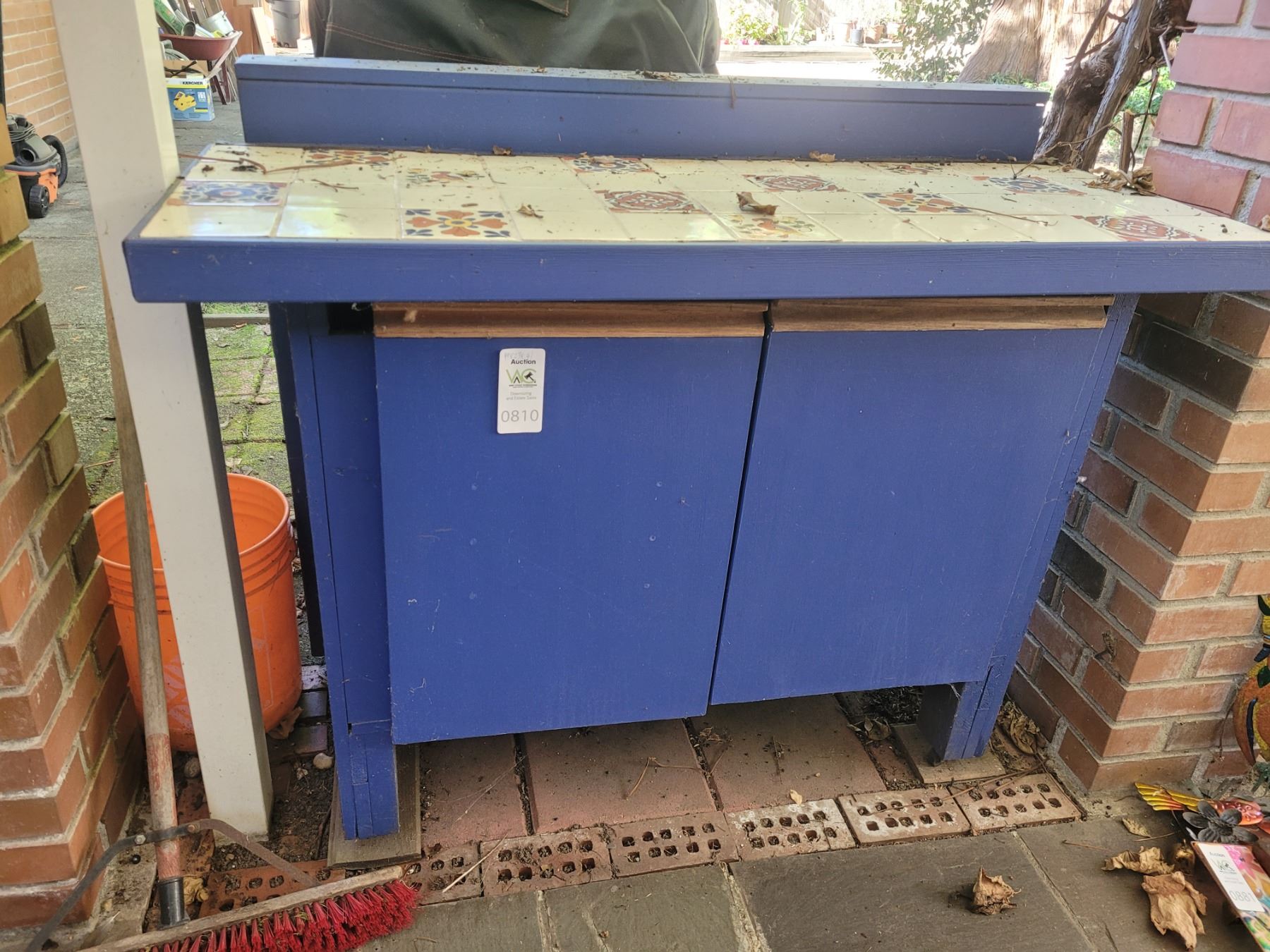 Tiled top, rolling cabinet 49x34x41 pickup at 10 am