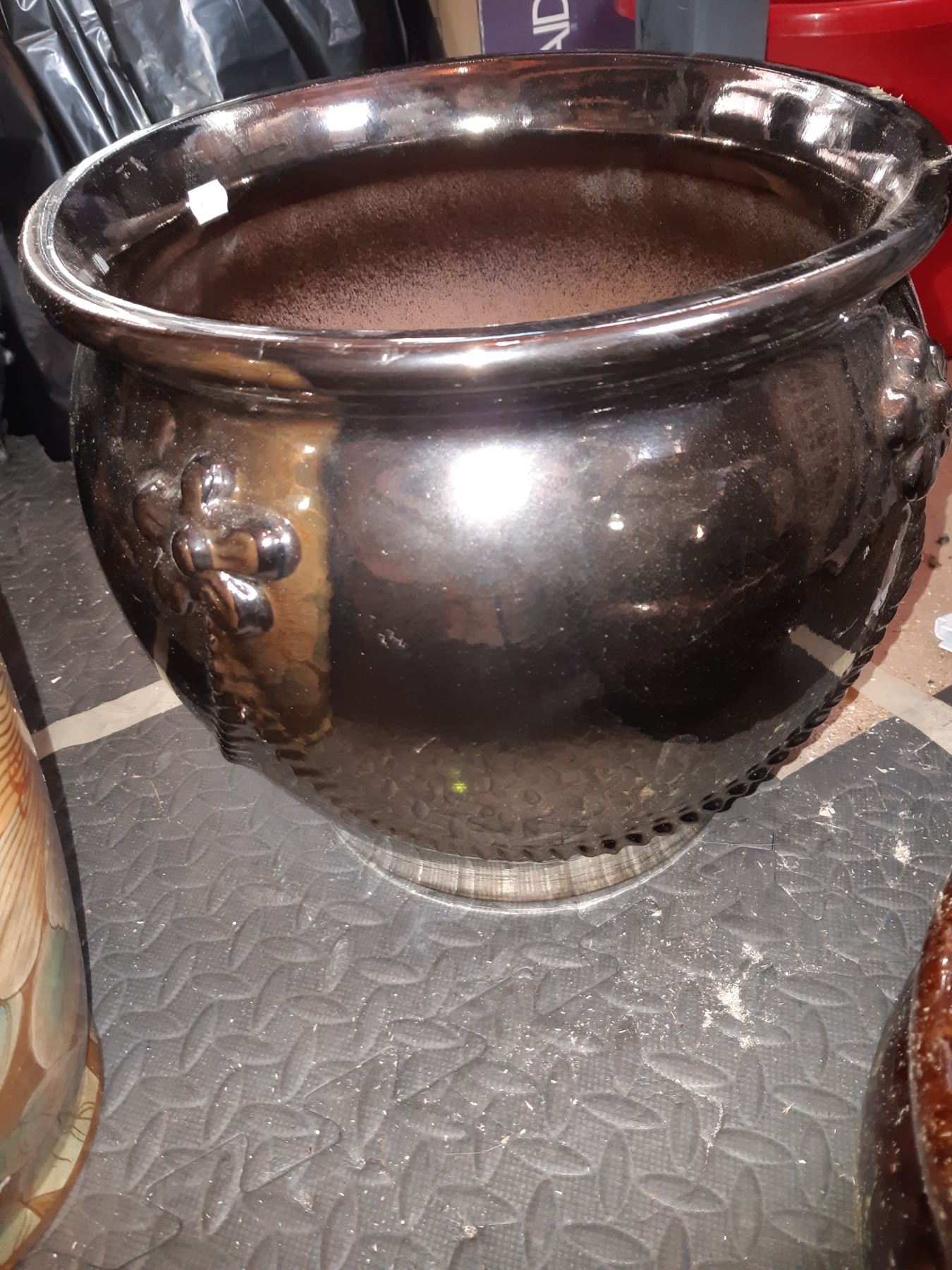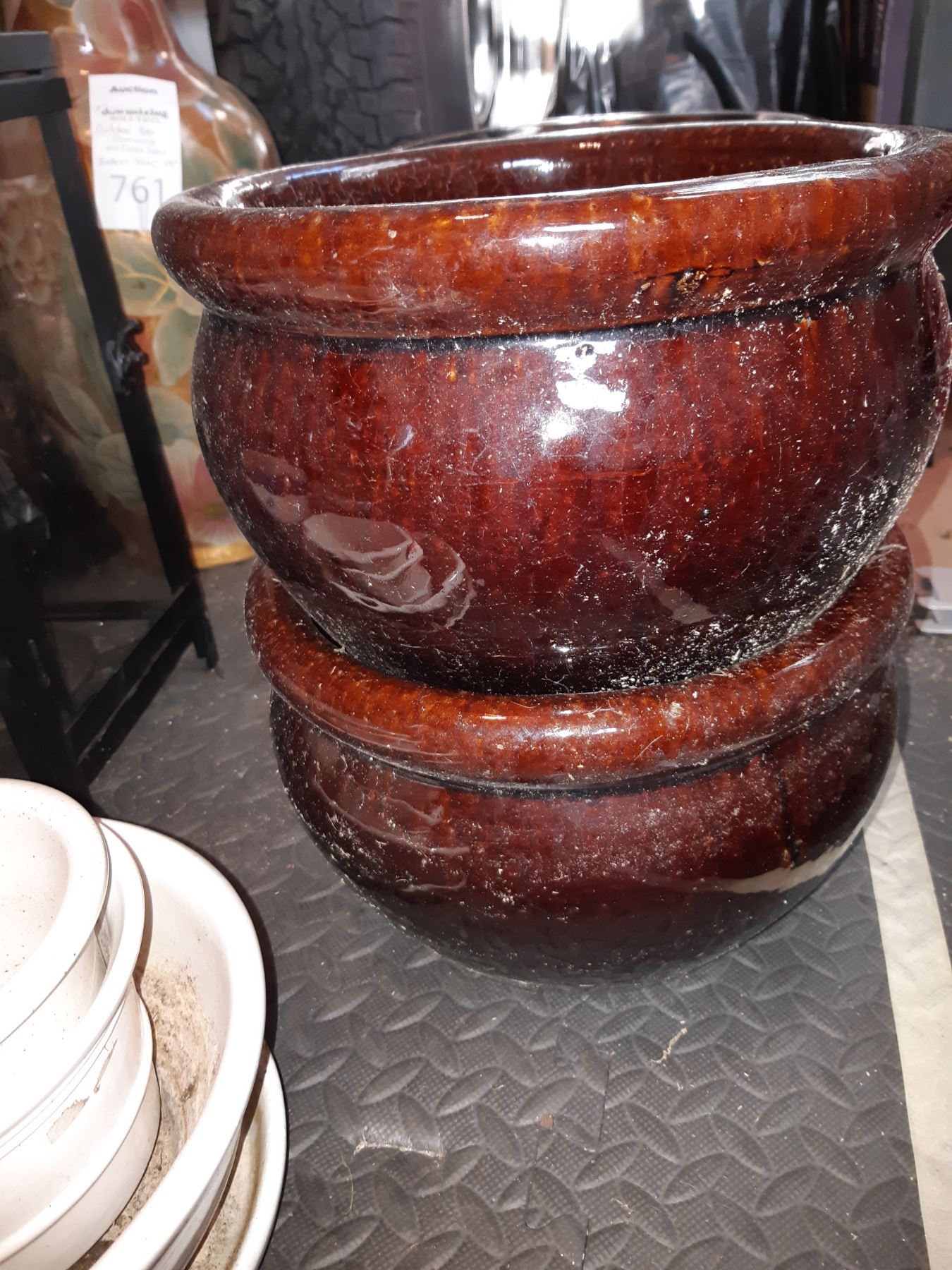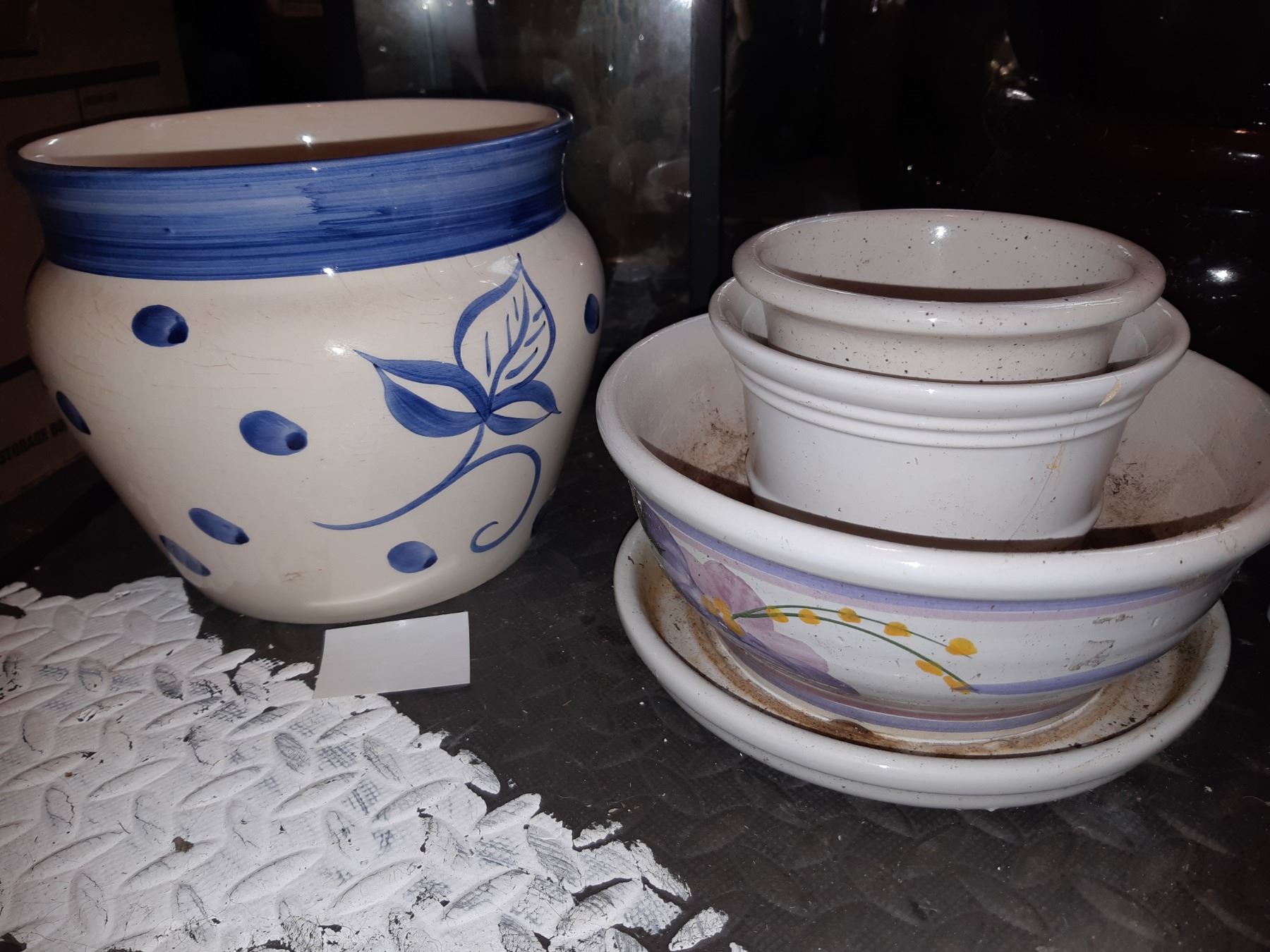 Assortment of outdoor pots and one 19" Vase. Bring packing materials and pickup at 9 am