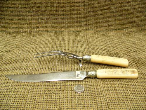 Outstanding old walrus ivory handled carving set with totem pole on each piece, blade by Ontario Knife Co. - crack in ivory on knife handle (3)