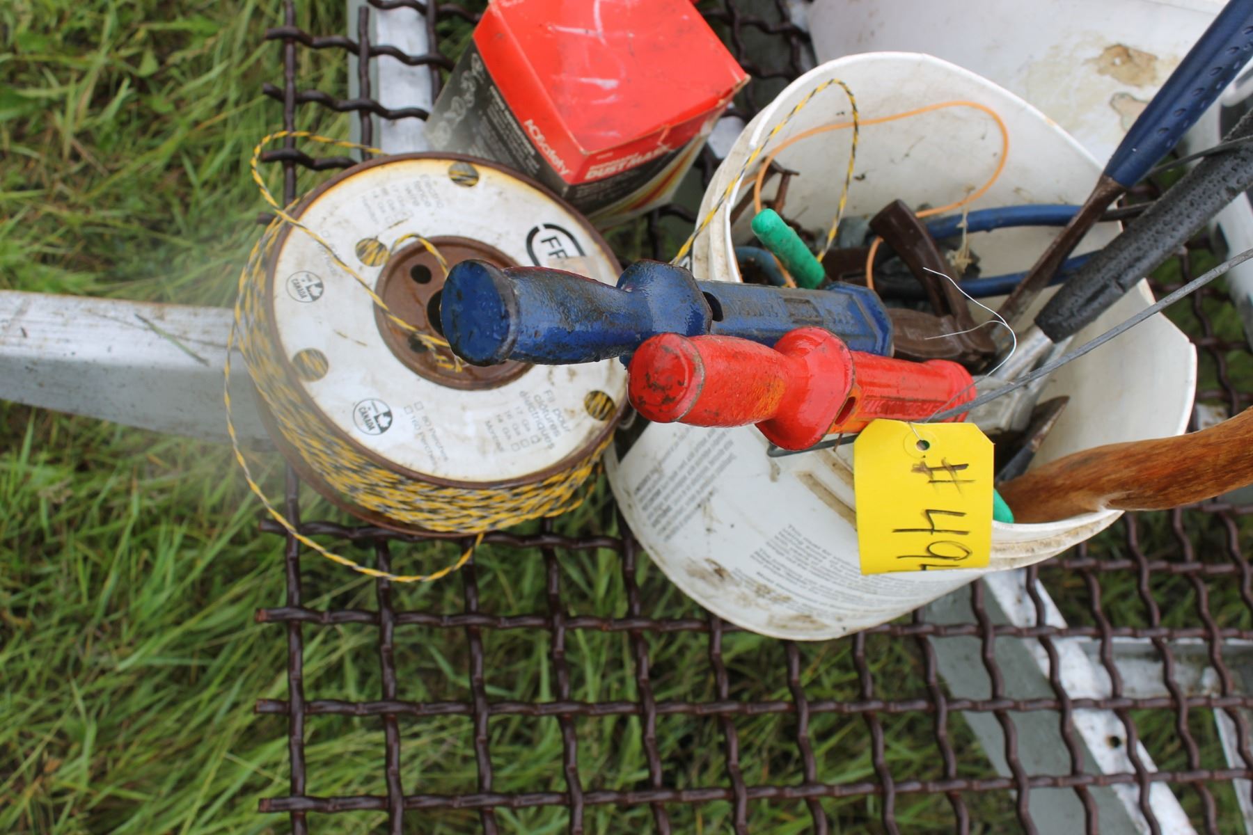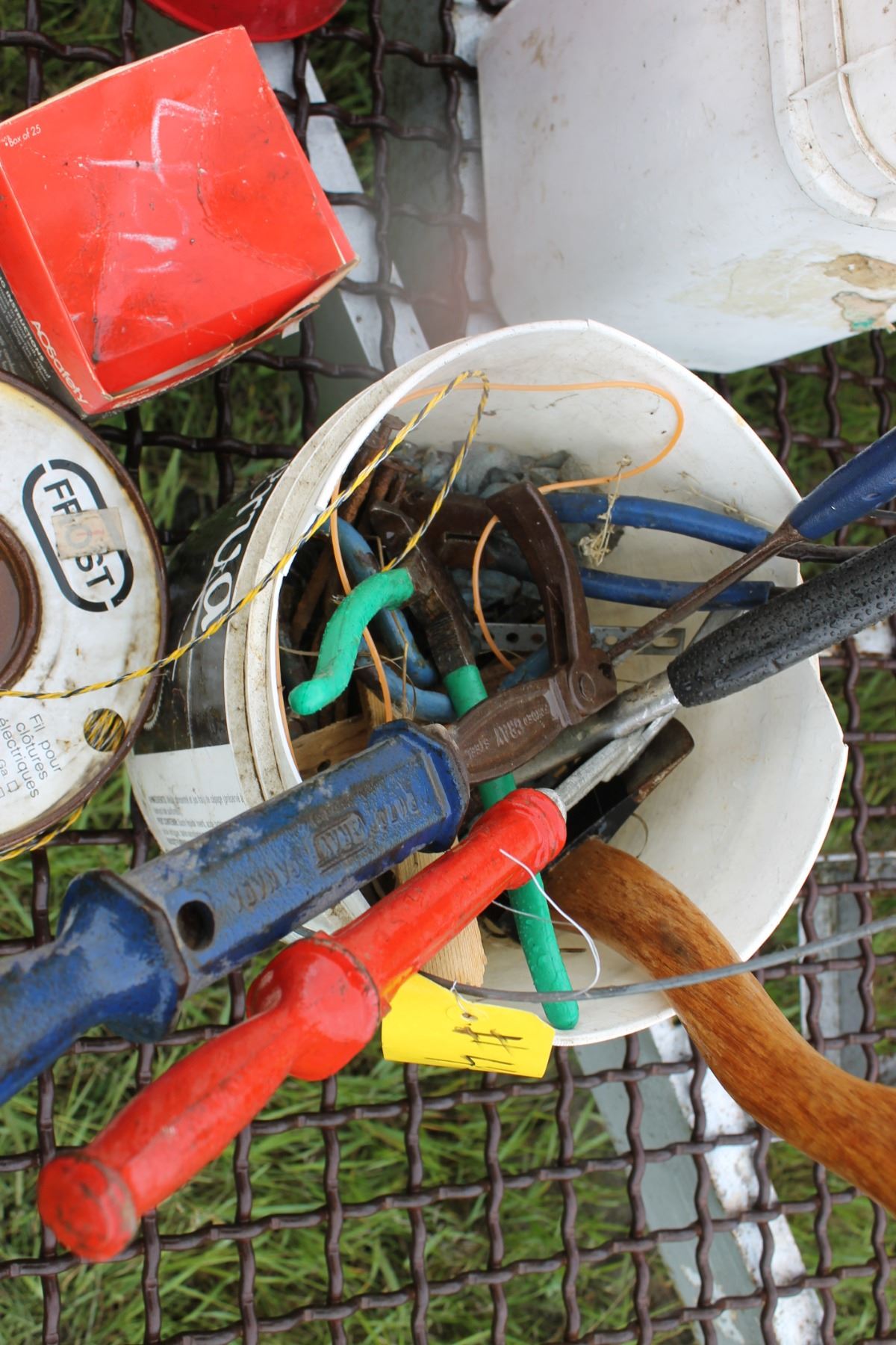 PAIL WITH NAIL PULLERS, HAMMERS, WRENCHES, ETC