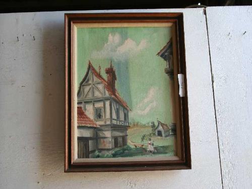 WOOD FRAMED OF A GIRL FEEDING THE HENS NEXT TO HER HOME 29" X 25"