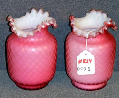PAIR FLUTED SATIN GLASS VASES 6.5" HIGH (ONE HAS CRACK)