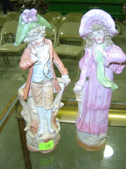 PAIR OF BISQUE COLONIAL FIGURINES; MOLD CRACK ON MAN'S NECK & FINGER