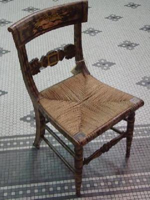 , hand painted and decorated, one chair has original rush seat, one chair has replaced "rope" woven seat, from Baltimore area, circa 1810-1835. Condition: finish is weathered.