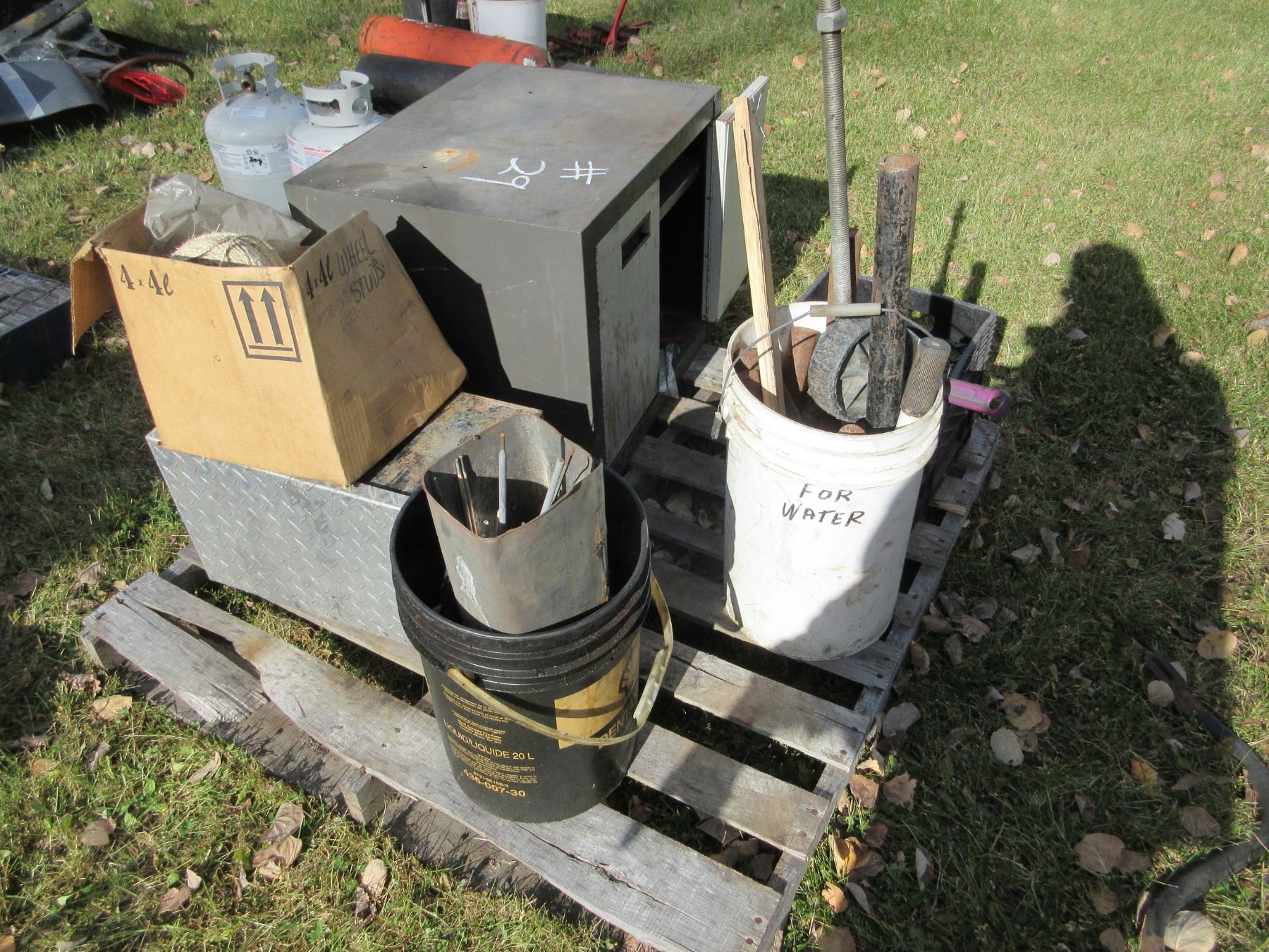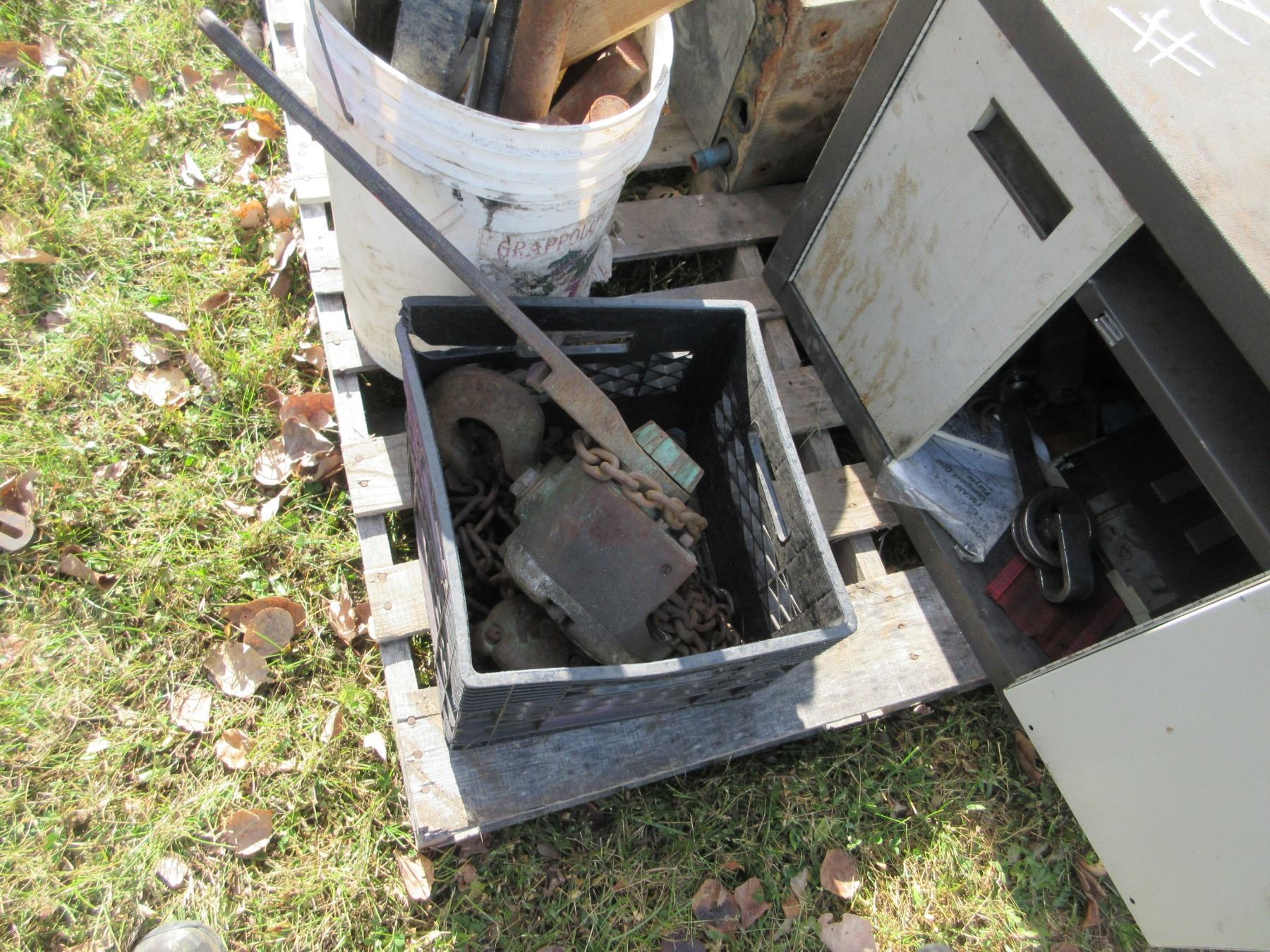 PALLET C/W 2 DOOR METAL CABINET, QUANTITY OF STEEL, CHAIN COME-ALONG, ETC