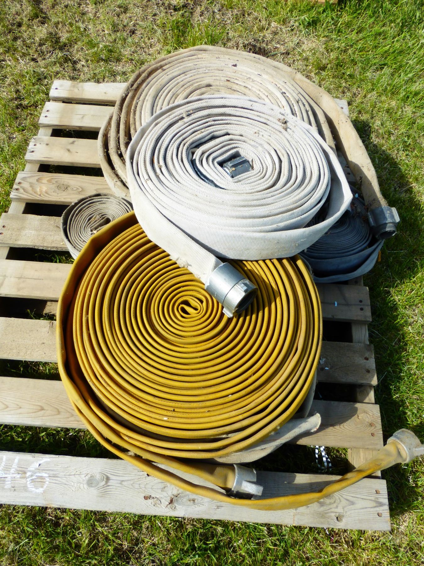 PALLET C/W ASSORTED HOSES, STEEL BIN & CONTENTS