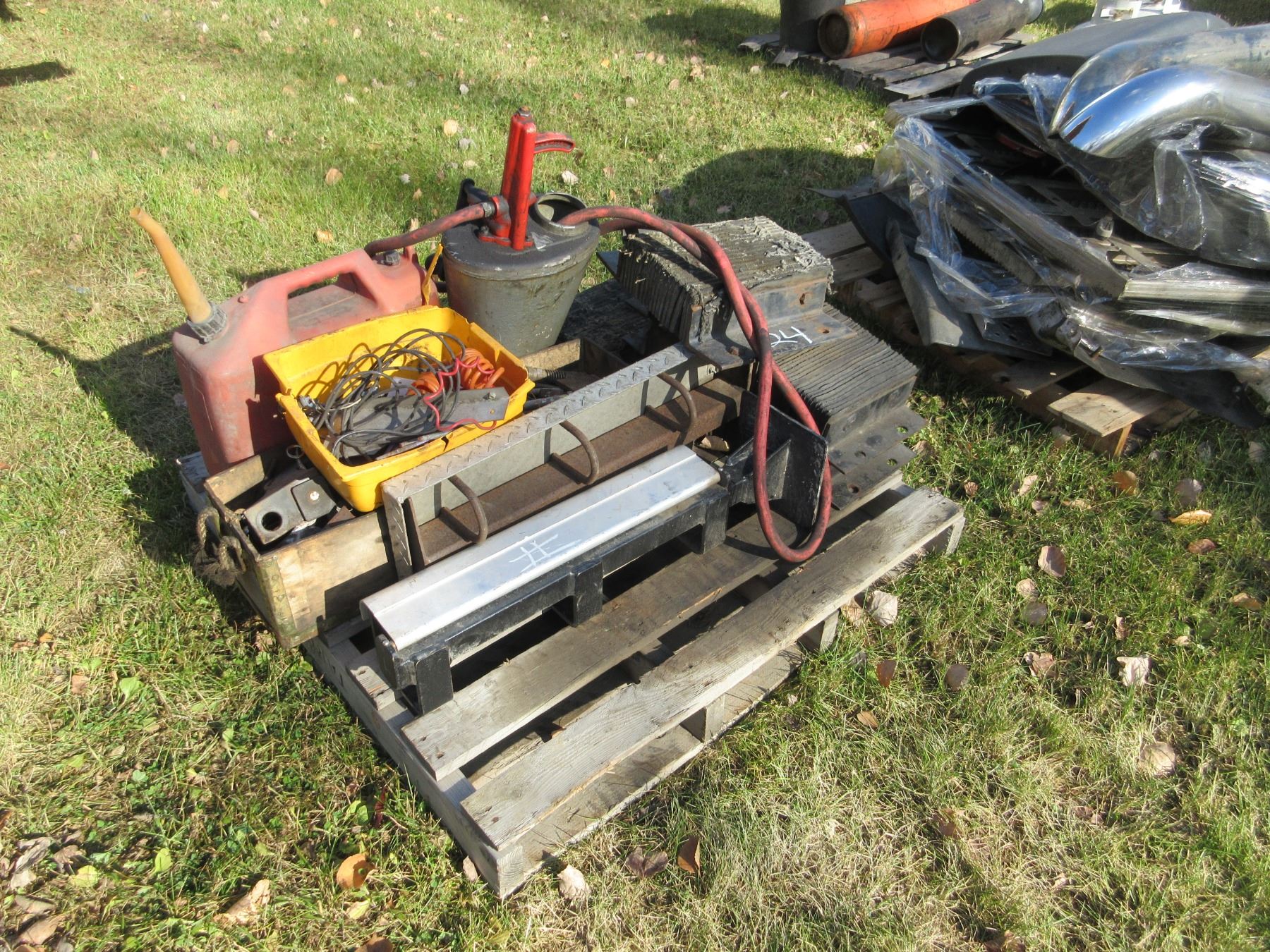 PALLET C/W GERRY CAN, GREASER, BUMPER STOPS, MISC STEEL, JACKS, ETC